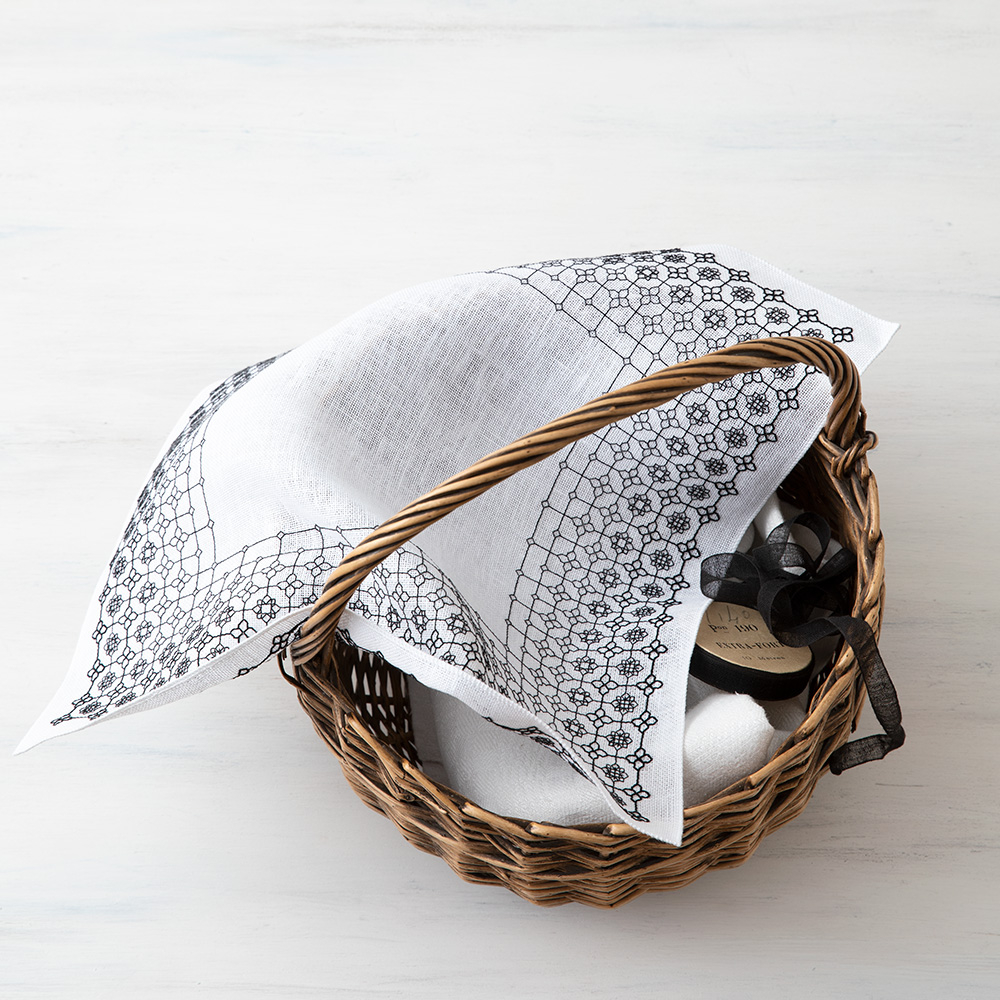 ムーア人によってもたらされスペインで始まったとされるブラックワーク。イギリスでは16 世紀初めに人気が高まり、裏側もきれいなダブルランニングステッチの技法はドレスの装飾等に多用されました。発展と衰退を経て、今では伝統刺繍としていくつかの技法が幅広く親しまれていますが、このレッスンではダブルランニングステッチで裏表を同一に刺す方法をご紹介します。きっと、新鮮な驚きと楽しさを感じていただけると思います。