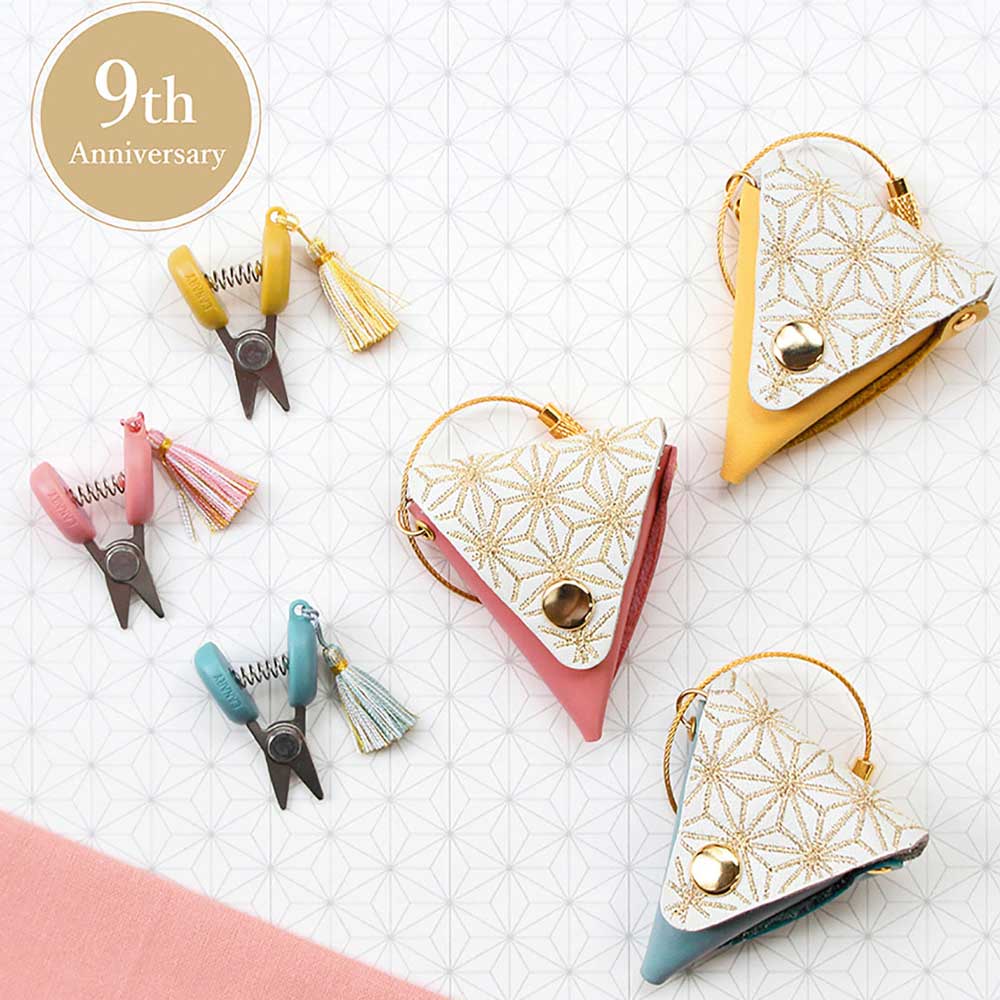 KAWAGUCHI×伝統工芸 「Cohana」made in JAPANの裁縫道具 手芸用具メーカー、KAWAGUCHIと日本の伝統工芸がコラボレーションして生まれたハンドメイド道具「Cohana」をご紹介します。9周年の感謝を込めてお届けする、特別な豆ばさみ。日頃の感謝の気持ちを込めて、人気のはさみを限定カラーでお届けします。 9周年限定で、豆ばさみがすっぽり入る革ケースが付属します。フラップ部分には古くから縁起の良い柄とされる麻の葉の文様を、繊細な金色の刺繍であしらいました。ワイヤーキーリングが付属しているので、裁縫バッグに取り付けて持ち運ぶことができます。実用性と共に、コレクションやギフトとしてもおすすめのアイテムです。 日本有数の刃物の町岐阜県関市の刃物メーカーがつくった豆はさみ。指でつまむように持ち、軽い力でカットできます。豆ばさみの可愛さをより一層引き立ててくれる絹糸の小さなタッセルは、福岡の房職人職人の繊細な技が光る美しい仕上がりに。