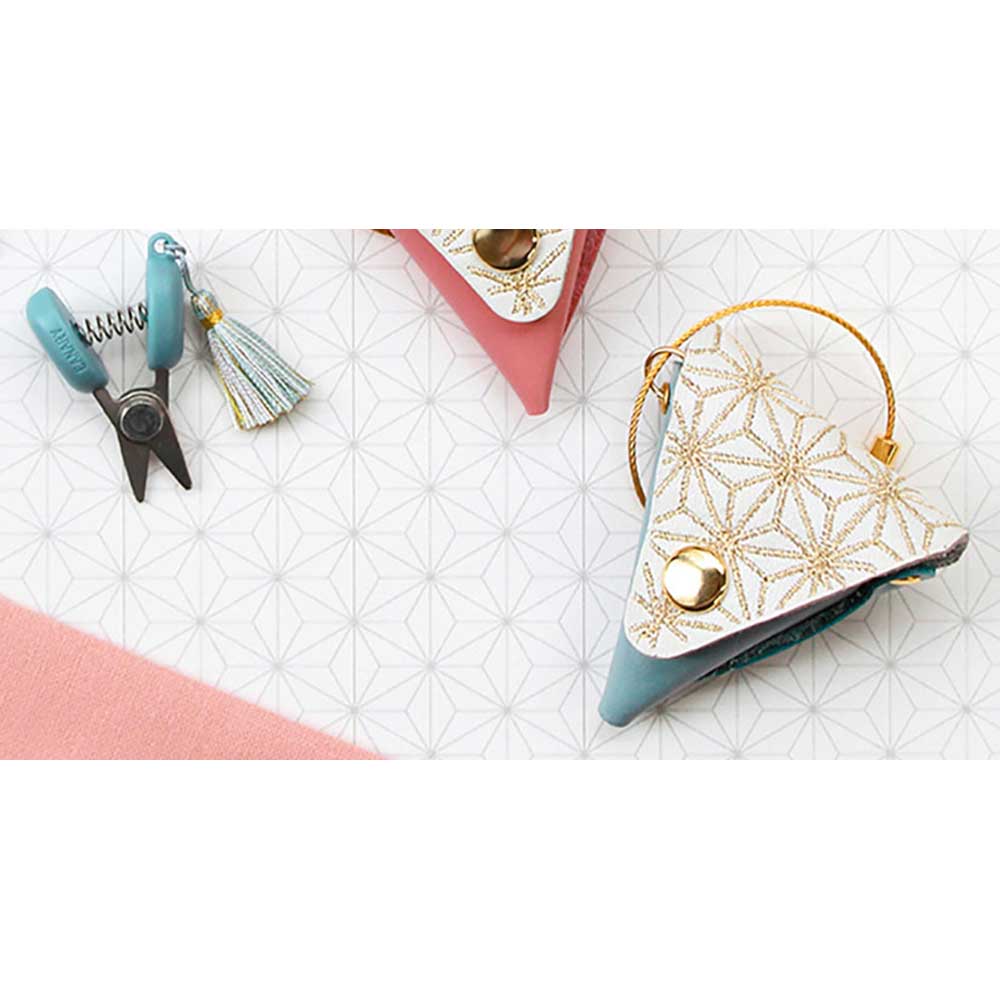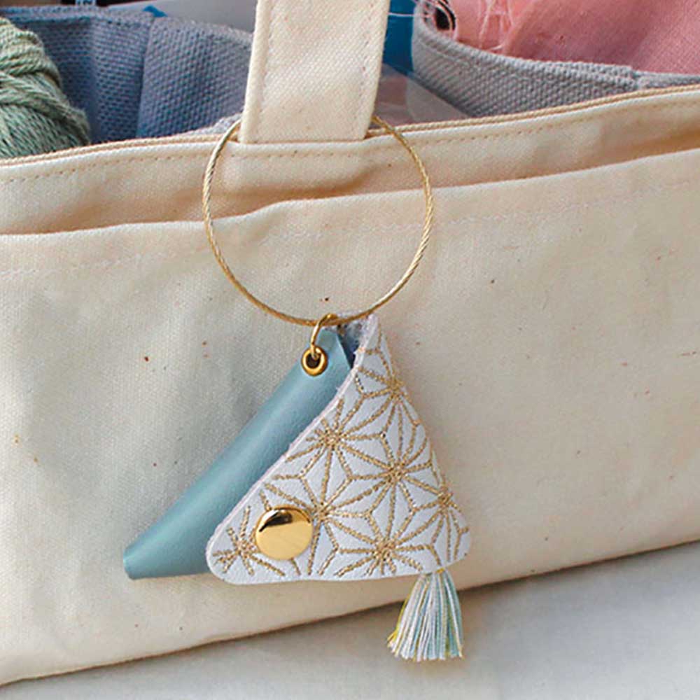 KAWAGUCHI×伝統工芸 「Cohana」made in JAPANの裁縫道具 手芸用具メーカー、KAWAGUCHIと日本の伝統工芸がコラボレーションして生まれたハンドメイド道具「Cohana」をご紹介します。9周年の感謝を込めてお届けする、特別な豆ばさみ。日頃の感謝の気持ちを込めて、人気のはさみを限定カラーでお届けします。 9周年限定で、豆ばさみがすっぽり入る革ケースが付属します。フラップ部分には古くから縁起の良い柄とされる麻の葉の文様を、繊細な金色の刺繍であしらいました。ワイヤーキーリングが付属しているので、裁縫バッグに取り付けて持ち運ぶことができます。実用性と共に、コレクションやギフトとしてもおすすめのアイテムです。 日本有数の刃物の町岐阜県関市の刃物メーカーがつくった豆はさみ。指でつまむように持ち、軽い力でカットできます。豆ばさみの可愛さをより一層引き立ててくれる絹糸の小さなタッセルは、福岡県の房職人の繊細な技が光っています。