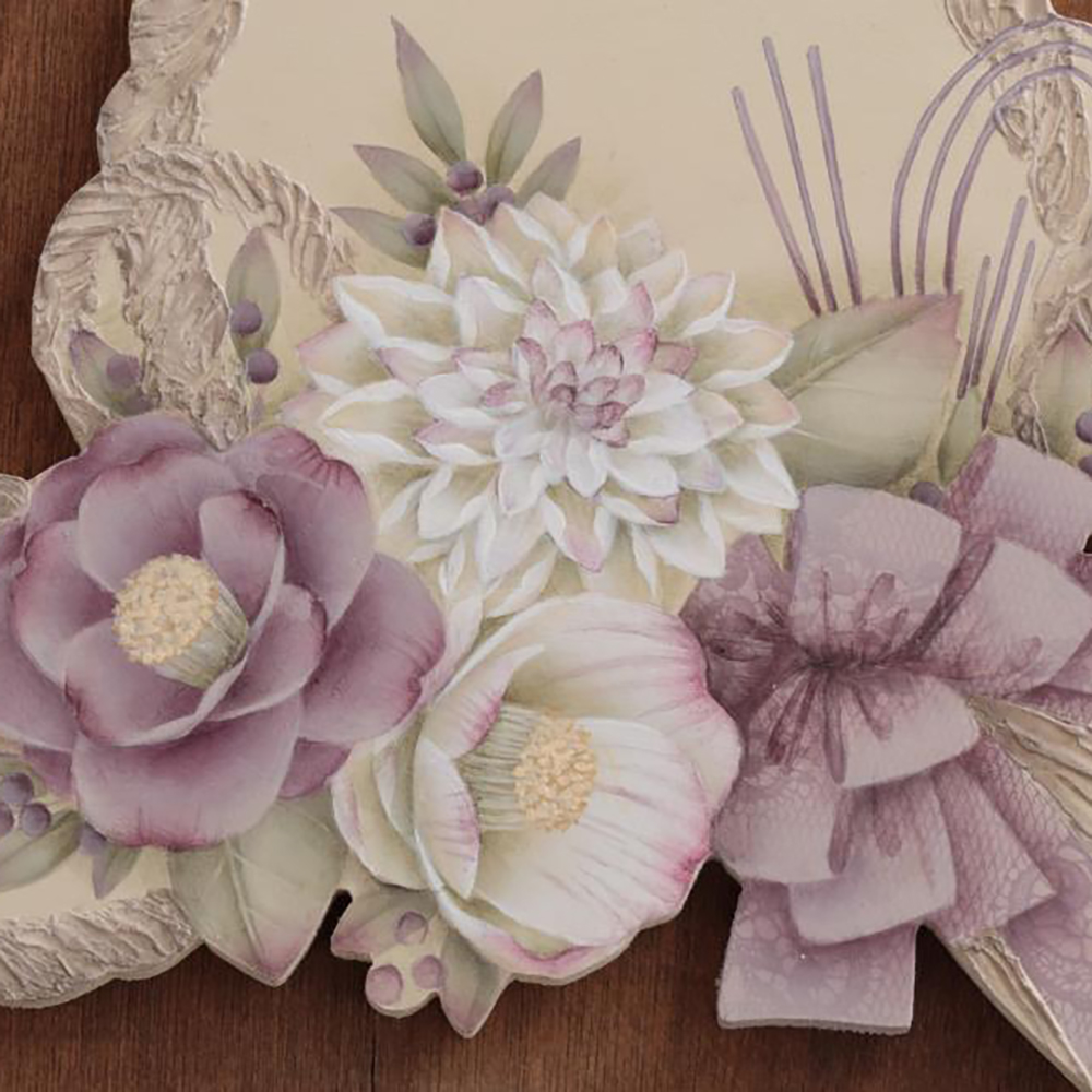 『ペイントクラフトデザインズvol.20』の24ページ掲載デザイン・制作は片山智桂子さんの「花飾り」を描く講座です。 実際に作品となった花々の描き方を詳しくレッスンしています。