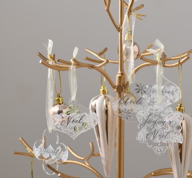透明なアクリルのリースに、シックなアースカラーで、モミの枝、ユーカリ、シダーローズ、ドングリ、松ぼっくり、スターアニスのリースを描きます。初級~中級のテクニックで描けます。ドライフラワーのイメージでシンプル&ナチュラルなインテリアに合わせてもおしゃれ。素材が透明なので、実物大カラーコピーを下に敷いて描いていくと便利です。レースとモダンカリグラフィーの文字は、シルクスクリーンを使ったプリントで、手軽に仕上げられます。レース模様は、裏面からシルクスクリーンをプリントします。『「牡丹の新春リース」を描く』の作品とセットで飾っても素敵。