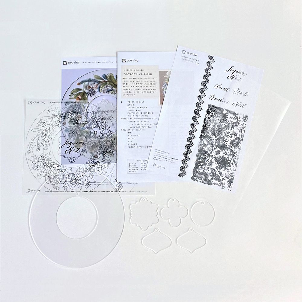 『ペイントクラフトデザインズvol.22』の58ページ掲載「木の実のグリーンリース」が描けます。透明なアクリルのリースに、シックなアースカラーで、モミの枝、ユーカリ、シダーローズ、ドングリ、松ぼっくり、スターアニスのリースを描きます。初級~中級のテクニックで描けます。ドライフラワーのイメージでシンプル&ナチュラルなインテリアに合わせてもおしゃれ。素材が透明なので、実物大カラーコピーを下に敷いて描いていくと便利です。レースとモダンカリグラフィーの文字は、シルクスクリーンを使ったプリントで、手軽に仕上げられます。レース模様は、裏面からシルクスクリーンをプリントします。『「牡丹の新春リース」を描く』の作品とセットで飾っても素敵。
