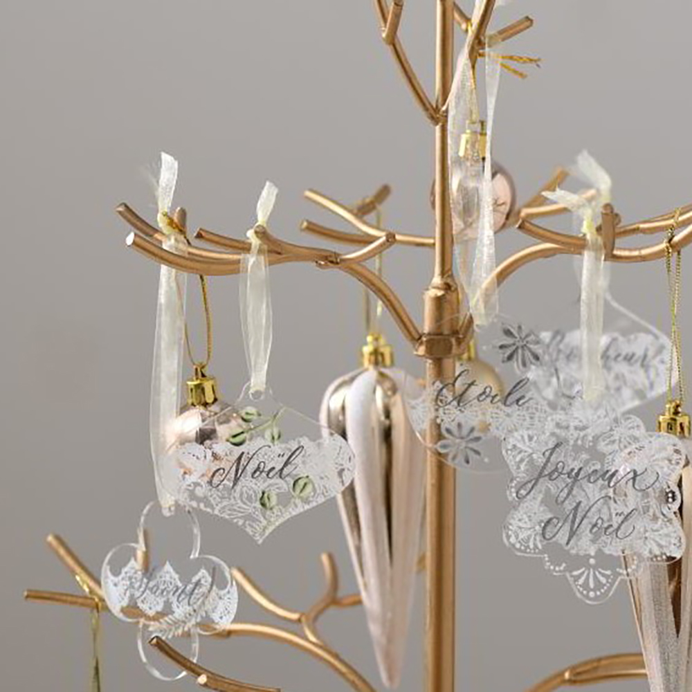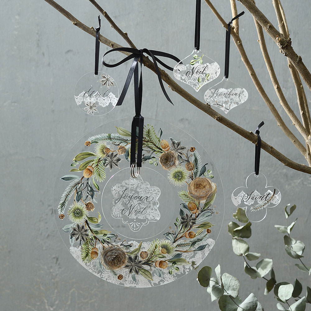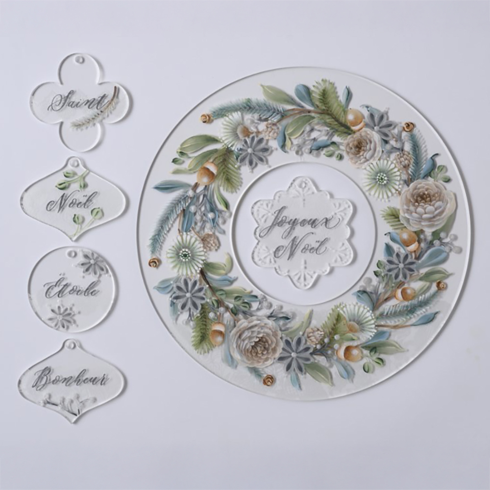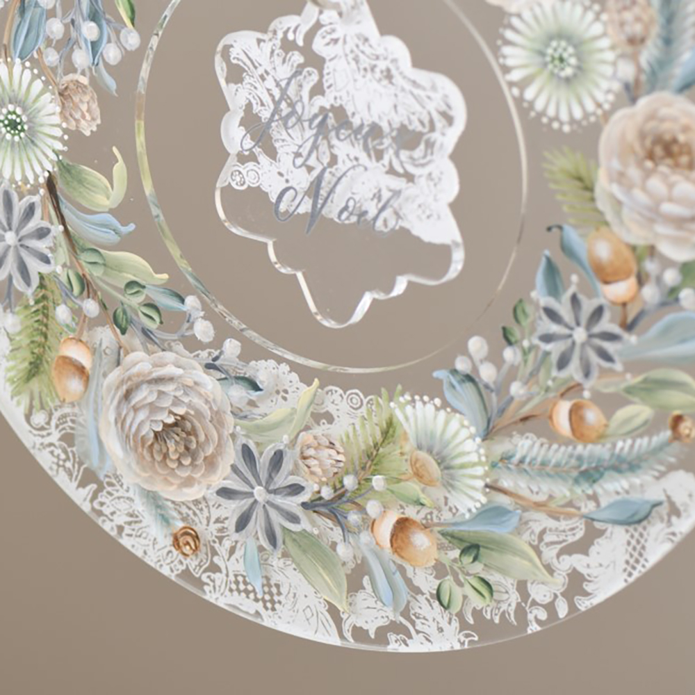 透明なアクリルのリースに、シックなアースカラーで、モミの枝、ユーカリ、シダーローズ、ドングリ、松ぼっくり、スターアニスのリースを描きます。初級~中級のテクニックで描けます。ドライフラワーのイメージでシンプル&ナチュラルなインテリアに合わせてもおしゃれ。素材が透明なので、実物大カラーコピーを下に敷いて描いていくと便利です。レースとモダンカリグラフィーの文字は、シルクスクリーンを使ったプリントで、手軽に仕上げられます。レース模様は、裏面からシルクスクリーンをプリントします。『「牡丹の新春リース」を描く』の作品とセットで飾っても素敵。