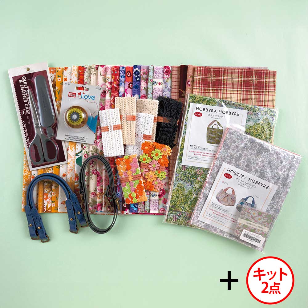 手芸キット4点、カットクロス(40×35cm)・24枚、持ち手1点、ショルダーベルト1点、レース7種、はさみ1点、ピンクッション1点
