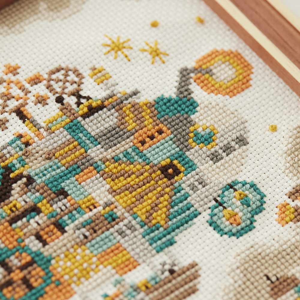 空想街雑貨店の水彩画を表現するため、目の細かい18カウントの布地に25番刺しゅう糸を2本どりで刺し、細部にわたり色を変えた魅力的なクロスステッチです。