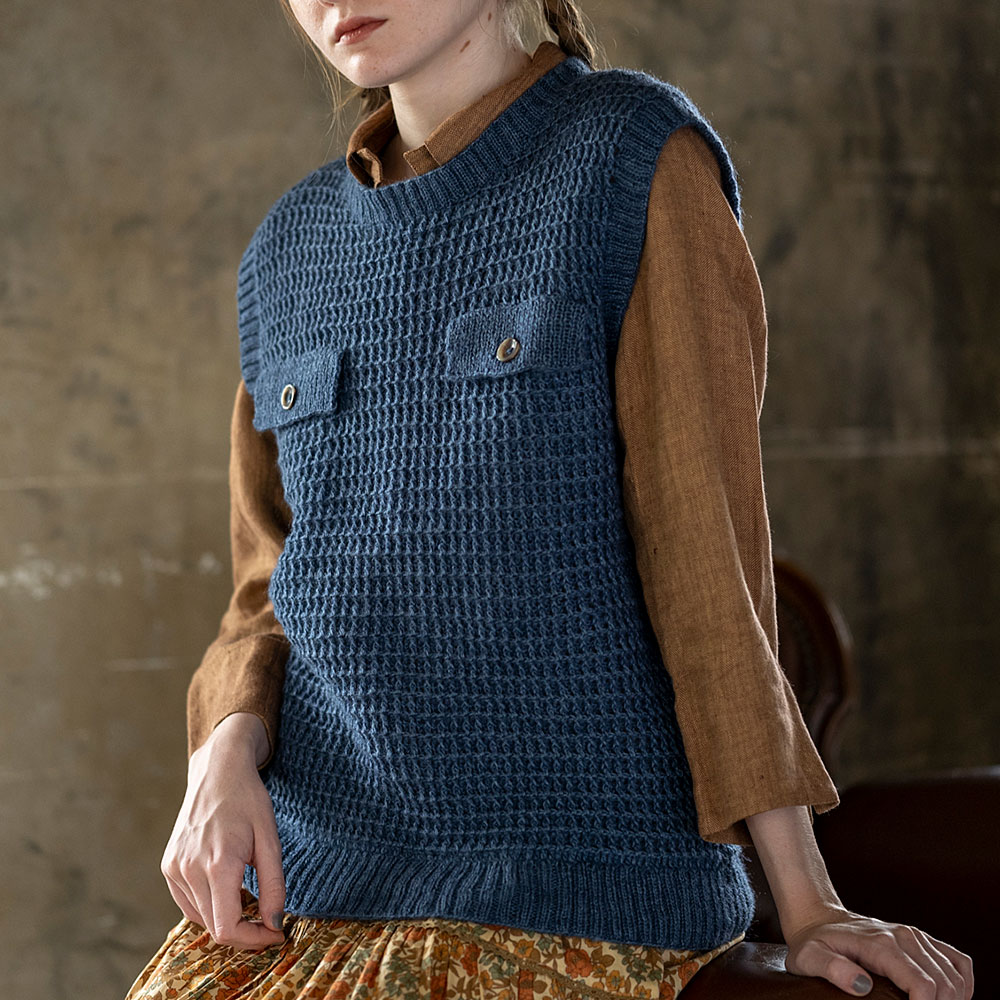 引き上げ編みの模様がワッフル地のように空気を包む、暖かさ満点のベスト。すっきりとシンプルな編み地は、メンズにもおすすめのユニセックスなデザインです。