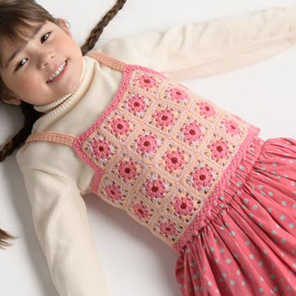 4色4段のモチーフを2種類の配色にして、編んでつなげたキャミソール。モチーフの枚数を変えて3サイズ展開にしています。こちらは一番小さなサイズ(110cm)です。