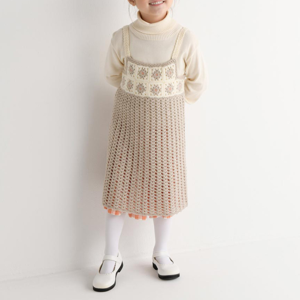 スカート部分にレーシーな模様編みを足してジャンパースカートに。上品でやわらかな配色で大人っぽく。