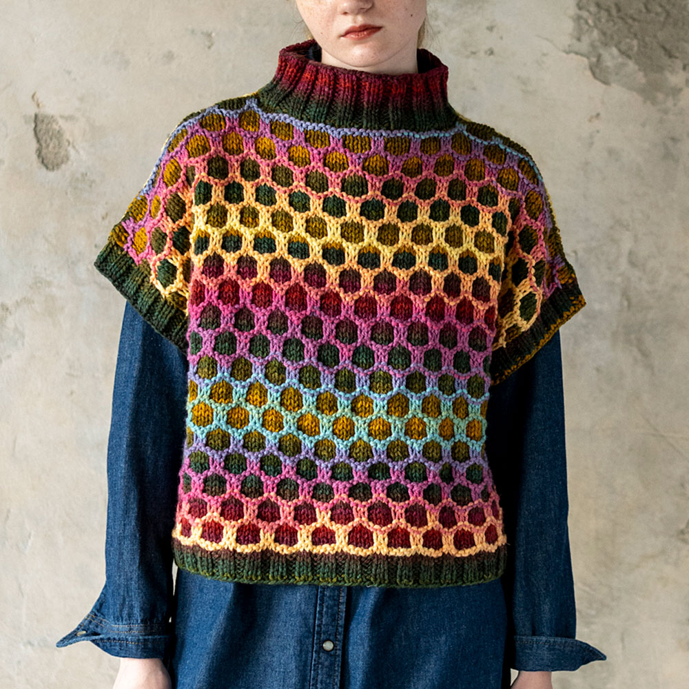 フレンチスリーブで、2 色の段染め糸をすべり目の縞模様に編んでハニカム風に。すべり目は「記号の2 段めから目をすべらせ、記号の終わりが編み終わり」。臆せずチャレンジして、段染めの魔法をもっと楽しみましょう。