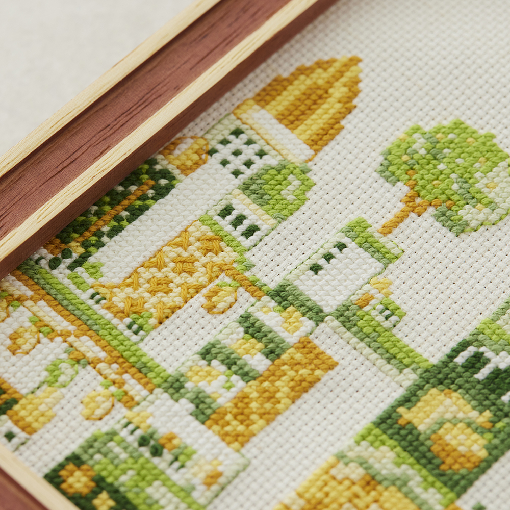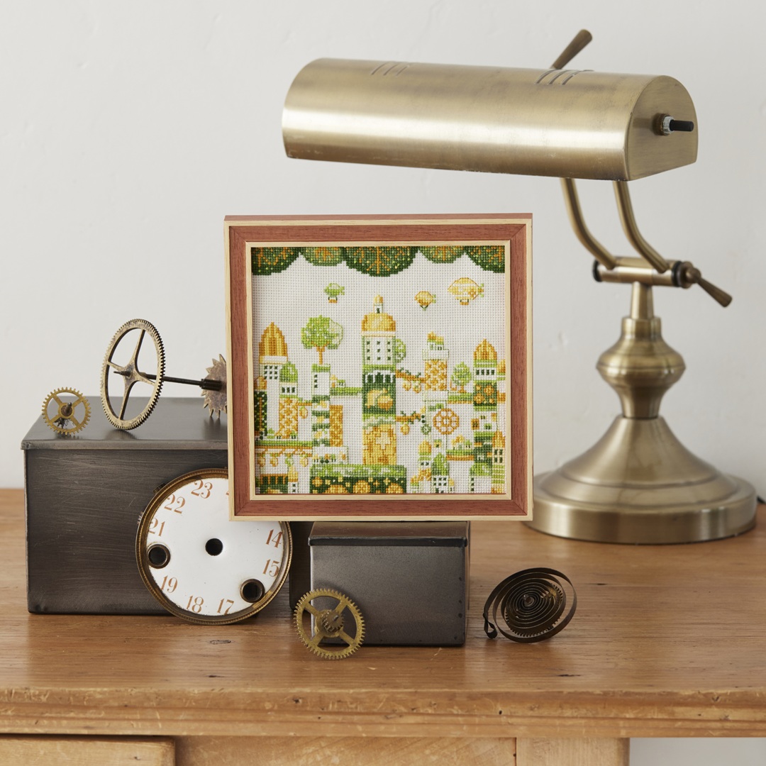 空想街雑貨店の水彩画を表現するため、目の細かい18カウントの布地に25番刺しゅう糸を2本どりで刺し、細部にわたり色を変えた魅力的なクロスステッチです。