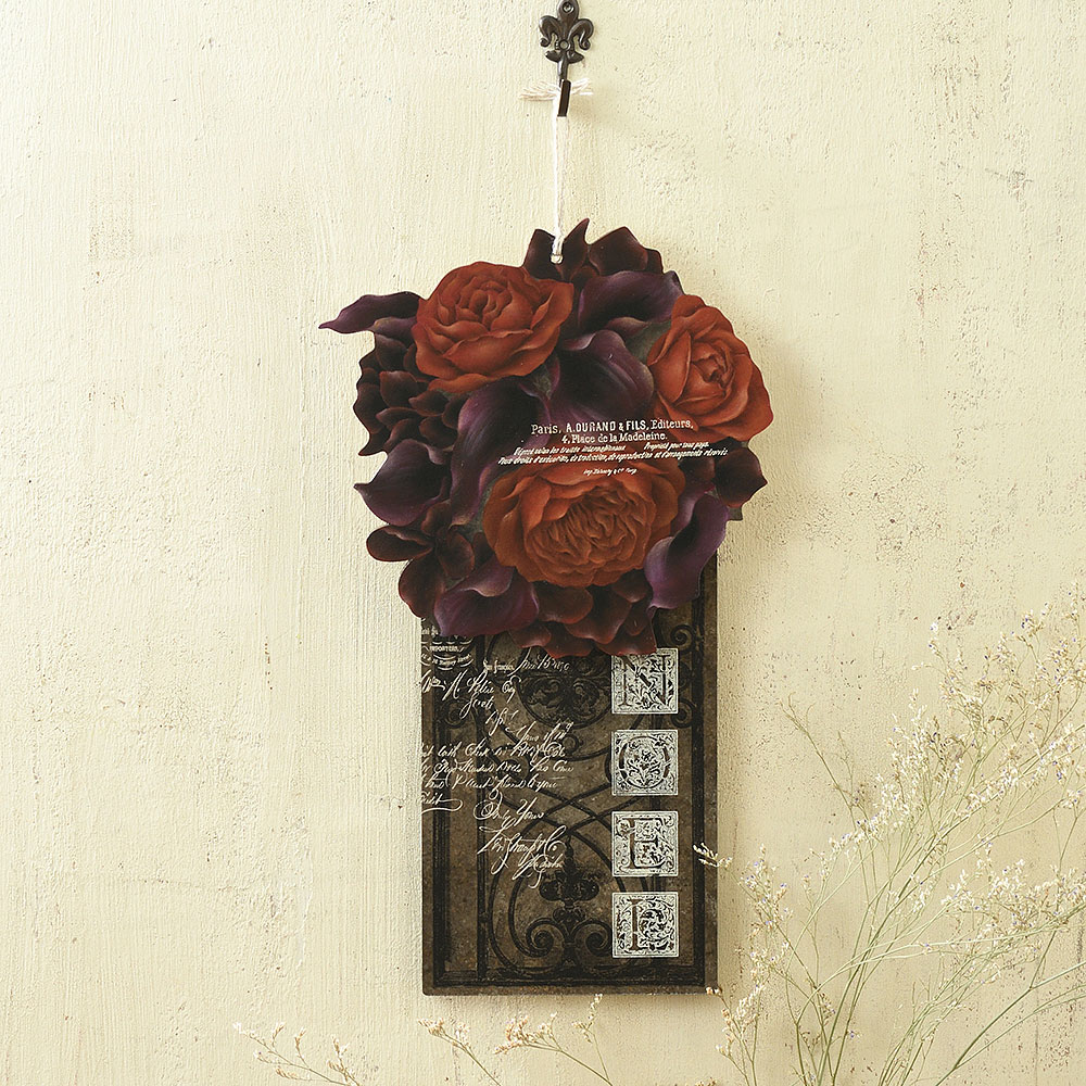 河崎 香さんデザインの、花束の形のカットアウトウッド&シンプルな長方形パネルのセットです。 長方形パネルの色違いアレンジ例もご紹介しているので、ぜひ裏面にお試しください。 アイアン模様と欧文のシルクスクリーンは、他の作品にも活用しやすそうです。2枚のボードを重ねたり、並べたり、1枚で飾ったり、場所やお好みに合わせて飾れます。長方形パネルは、色違いのアレンジなど手軽に裏面の活用ができます。 色指定では、アイボリー系のアレンジ例のご紹介もしています。 『ペイントクラフトデザインズvol.22』59ページ掲載監修:河崎 香