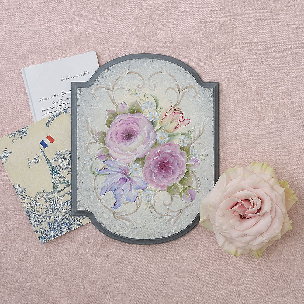『ペイントクラフトデザインズvol.27』でご紹介の 「フレンチブーケ ~Bouquet ? la Fran?aise」が描けます。バロック~ロココ風のクラシカルで華やかなプラークです。メインの花4種は、描き方がそれぞれ異なり、多様なテクニックが楽しめます。バラとチューリップのブーケに、バロック~ロココ様式の装飾に見られる、つる草模様を添えたクラシカルで華やかなプラークです。背景や縁まわりは、グレー系で甘さを抑えたフレンチシックな配色です。監修:沖 昭子