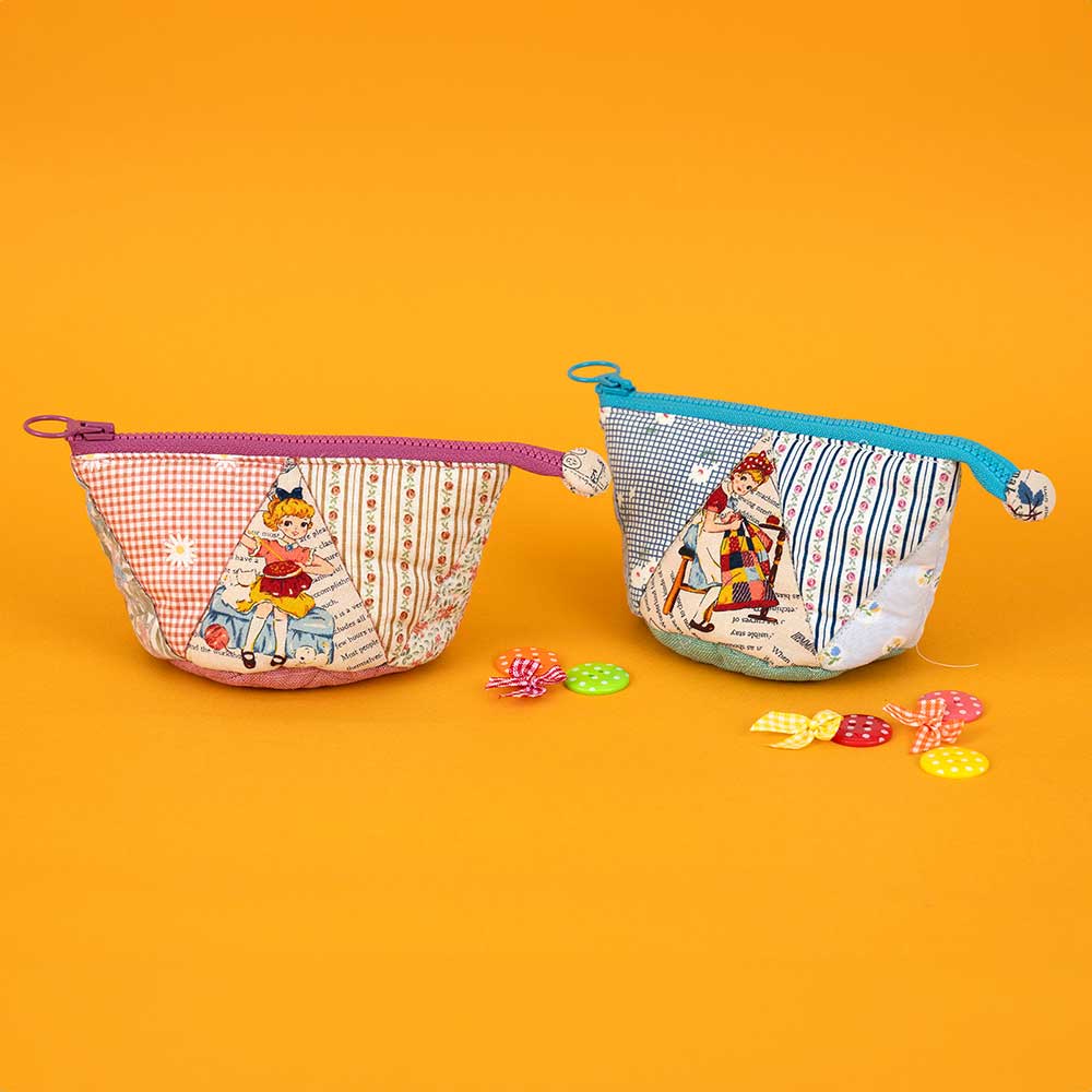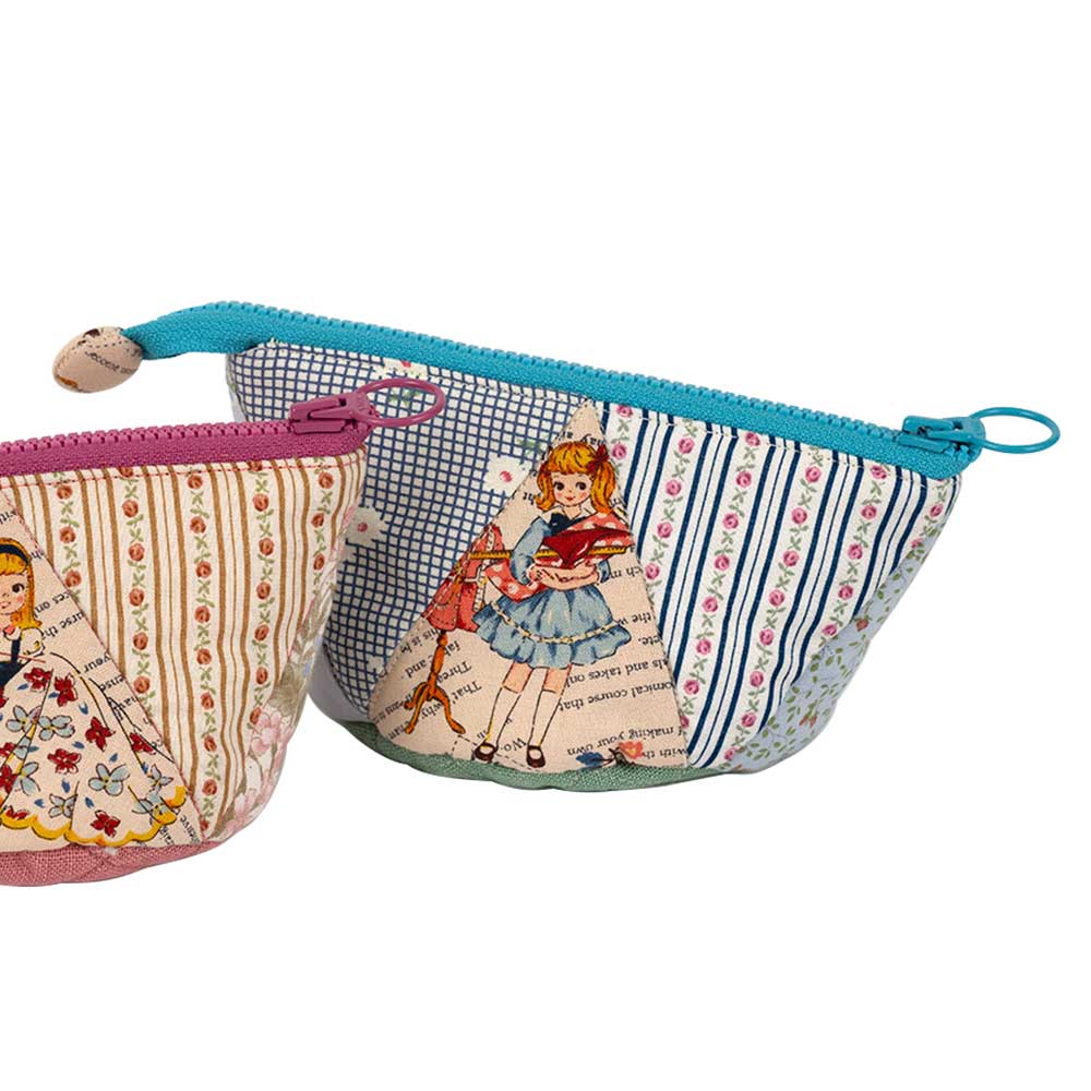 【キット作り方つき】キルトや刺しゅうを楽しむ、レトロガーリーな女の子たちの柄布を中心にピースワーク。収納力のある丸底ポーチ2色です。取りつけが簡単なフリースタイルファスナーを使用します。