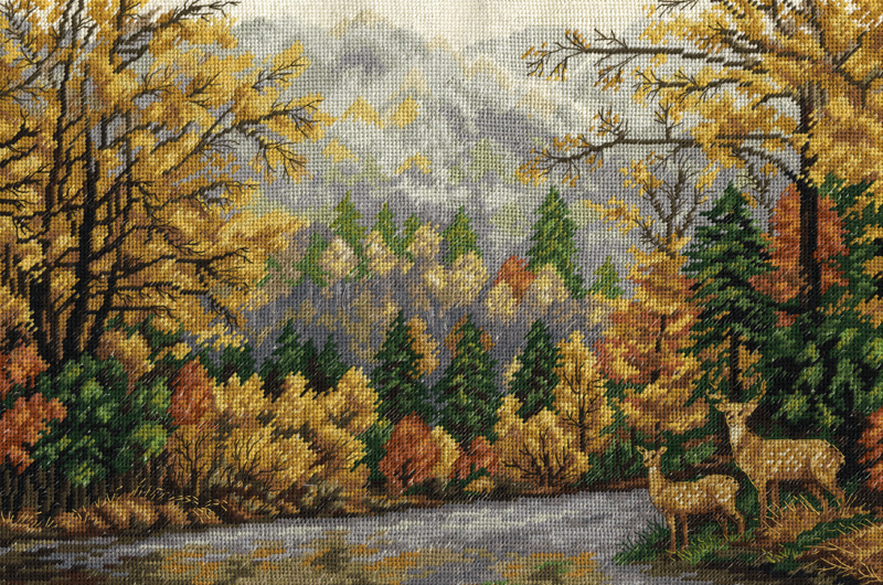 【キット作り方つき】美しい紅葉の森をハーフクロスステッチで描いた、静寂感漂う作品です。上級の方向き。
