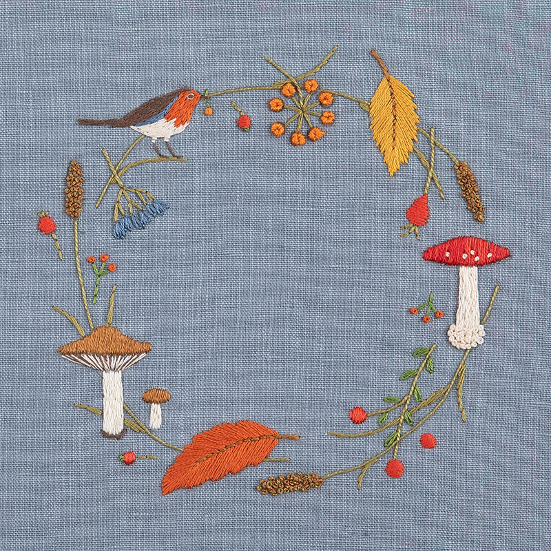 【キット作り方つき】「ステッチイデー」vol.35の付録。青木和子さんデザインの『stitch calendar2022』がキットになりました。キノコ、木の実、鳥たち。実りの秋の野山に集う様子を思い浮かべて。布に図案が印刷済みなので、届いたらすぐに刺し始めることができます。額やパネルに仕立てて季節ごとに飾って楽しめます。