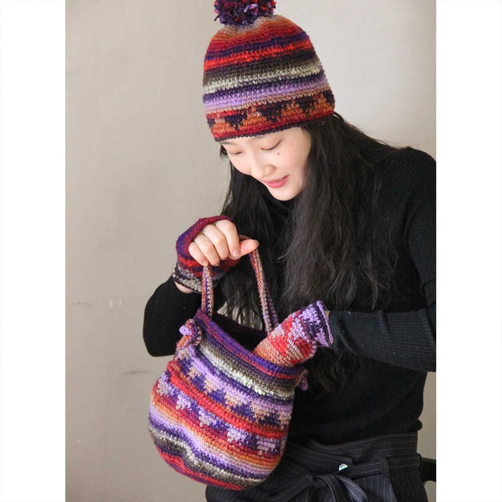 【キット作り方つき】【単品毛糸追加可能】「野呂英作」を代表する人気の糸「くれよん」。深みのある色合いが力強く変化する、ドラマティックな新色の3玉セット。①バッグ(3玉使用)②帽子(2玉使用)③アームウォーマー(1玉使用)の3種類の編み図付きなので、お好みで作れます。糸は1色ですが、編み始めの色が変わるようにして、糸を渡さずに編み込みます。初~中級。