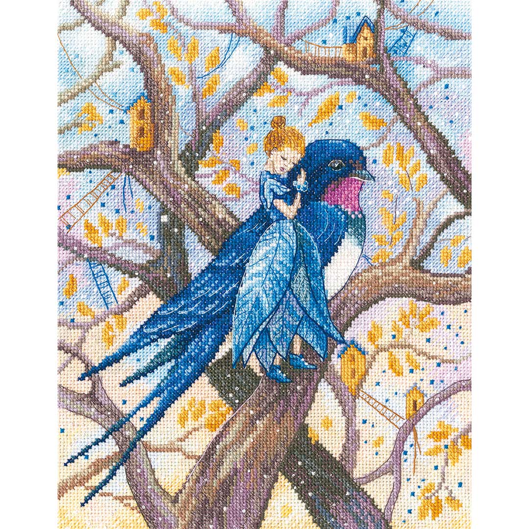 【キット作り方つき】アンデルセン童話「おやゆび姫」のワンシーンを描いたクロスステッチ作品。モグラのもとから助け出してくれたツバメは、どこに連れて行ってくれるのでしょうか。上級の方向き図案が大きくて見やすいエストニア・RTO社製。