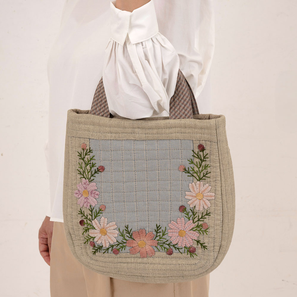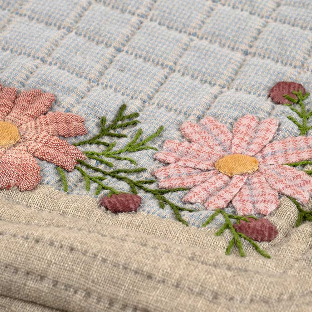 【キット作り方つき】澄み渡る秋空のような水色の先 染め布を背景に、繊細なアップリケと刺しゅうでコスモスを表現しました。後ろは1枚布です。