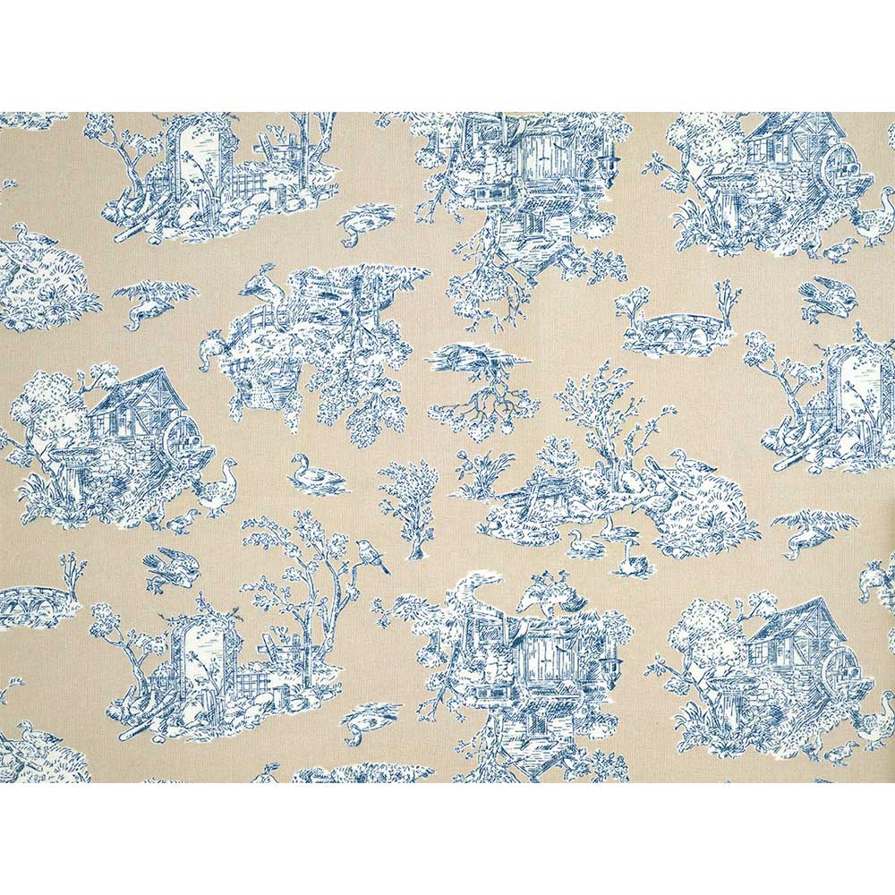 [限定100][シーチング]ベージュ地に、鳥や水車小屋など素朴な風景を描いたプリント。裏布以外にも、インテリアなどにもおすすめ。5mにカット済でお届けします。
