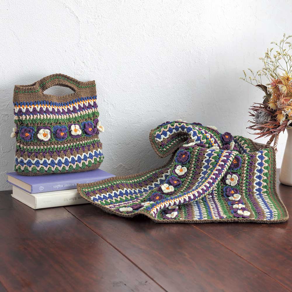 【キット作り方つき】大人気のビオラのモチーフを編みつなぎ、ボーダー模様と合わせて仕上げるバッグと、同シリーズのブランケットです。バッグは中袋つきで伸びにくい仕立て。ブランケットはひざ掛けにもなるサイズ。どちらも中級以上の方にお勧めします。