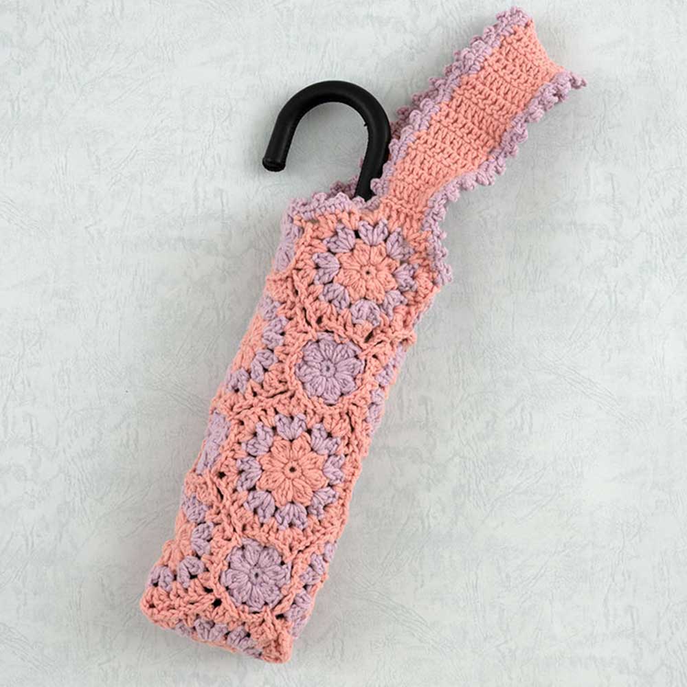 【キット作り方つき】人気のお花モチーフつなぎのワンハンドルの折りたたみ傘ケース。ピーチとライラックのやさしい色合いが大人かわいく、持つだけで気持ちがウキウキするデザインです。編みながらモチーフをつなげていくので、仕上げも簡単&すっきり。ペットボトルカバーとしても使えます。中級。
