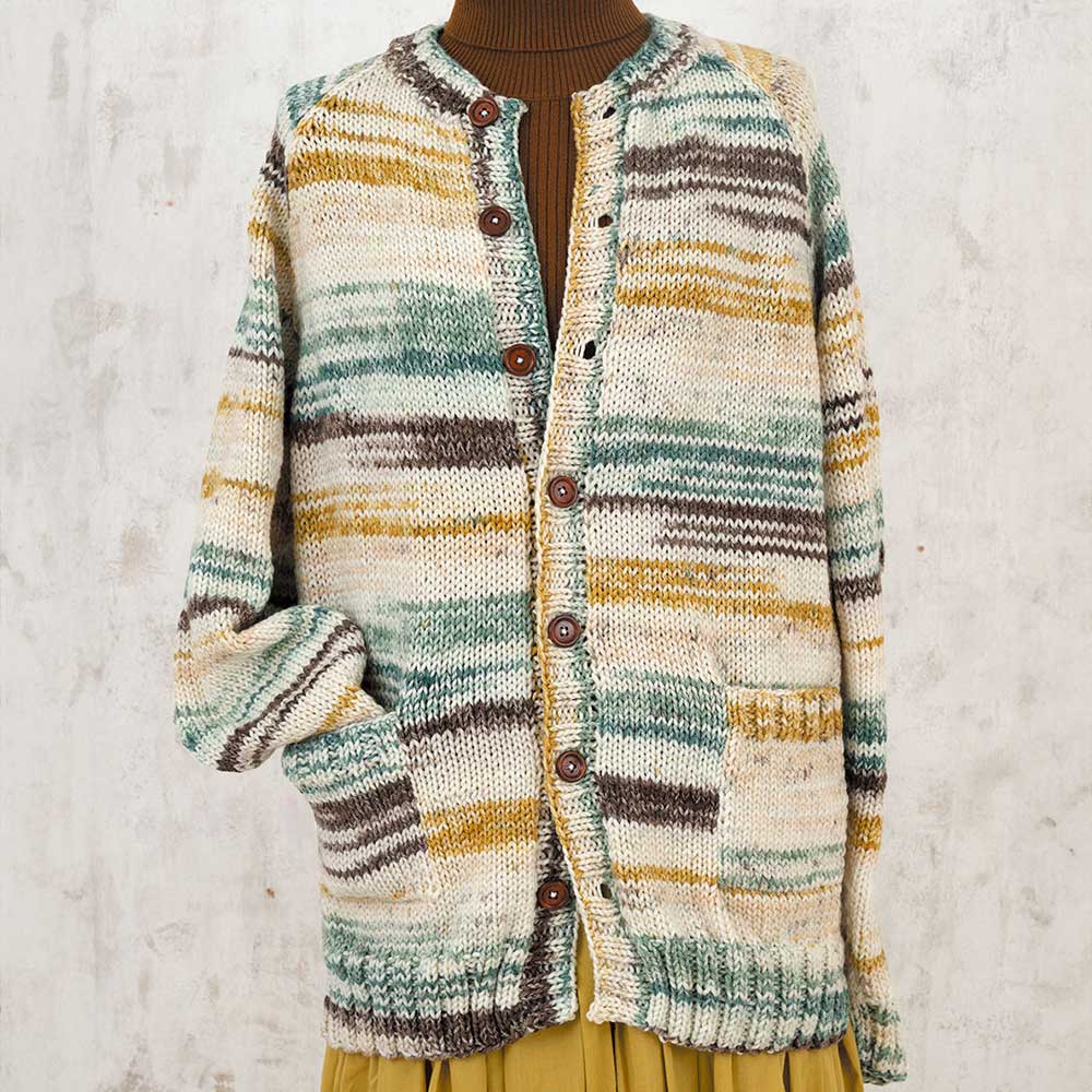 【キット作り方つき】カラフルでカジュアルな雰囲気が魅力のプリントヤーンで編むユニセックスのカーディガンです。極太糸でザクザクとテンポよく編めるのも嬉しいポイント。シンプルなメリヤス編みだけですが、グラデーションが自然に浮かび上がり、まるで凝った模様のような仕上がりに。ポケット付きのデザインで実用性もあり、日常使いにぴったりです。男女兼用タイプなので、パートナーとシェアしたり、プレゼントにも喜ばれます。中級。