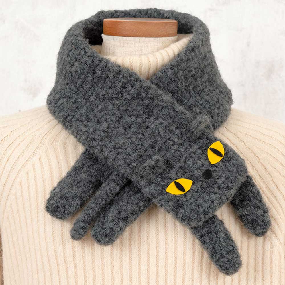【キット・作り方つき】人気のネコモチーフを、落ち着いた雰囲気で仕上げ、大人も楽しめるティペットです。キリリとした目元が印象的なネコの顔は、甘すぎず程よくクールなデザインで、さりげなく個性を引き立てます。使用するのは、やわらかくてふわふわのアルパカ混糸。首元に優しくフィットして、着け心地も良くあたたかです。さらに、差し込みタイプなので着脱が簡単。忙しい朝でもサッとつけられて、普段使いにもぴったりです。寒い季節のおしゃれのアクセントに。ネコ好きな方へのプレゼントにもおすすめです。中級。