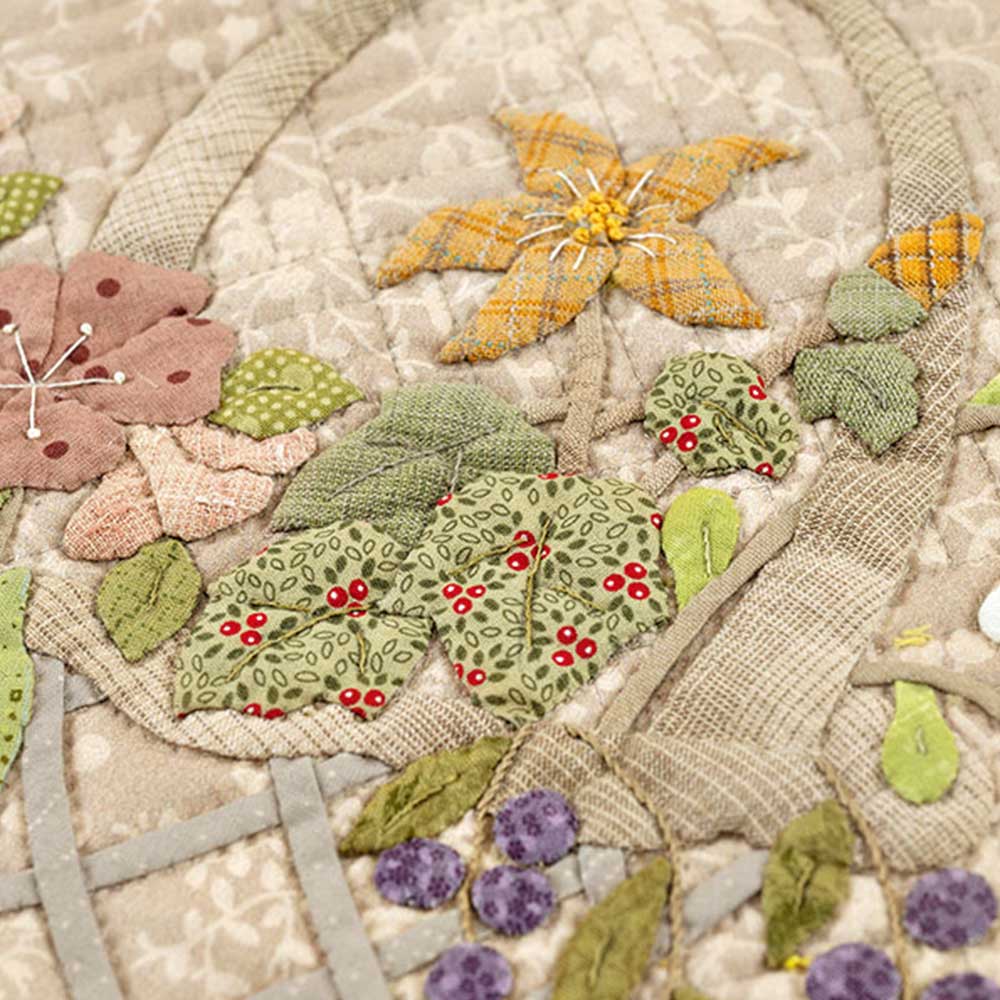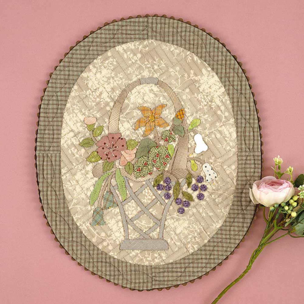 【キット作り方つき】だ円の形にバスケット入りの花をアップリケする、どこかクラシカルな印象のタペストリー です。周囲には山道テープを飾ります。