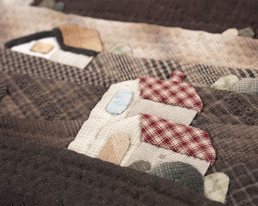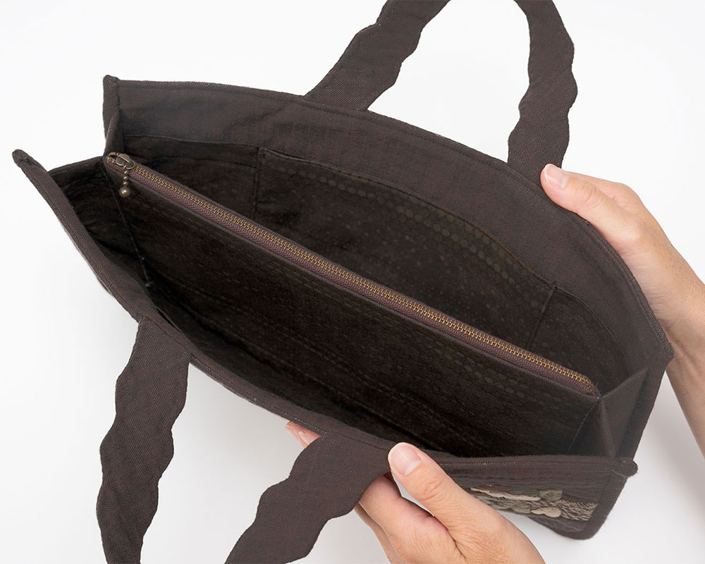 【キット作り方つき】ノスタルジックな山の上の街並みをアップリケした手さげです。書類や端末なども入る便利なサイズ。後ろは1枚布で仕立てます。