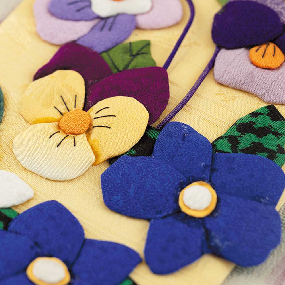 【キット作り方つき】【古裂】花器に入った様々な色のパンジーを押絵で表現。ちょっとしたスペースに飾れるサイズです。土台にも厚紙を入れるので、壁に立て掛けても飾れます。