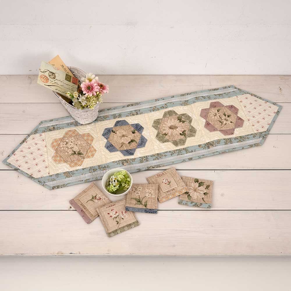 【キット作り方つき】優しい色合いのテーブルセンターと、コースター5枚が作れます。ダイニングやリビングに、春めく気分を運んでくれそうです。