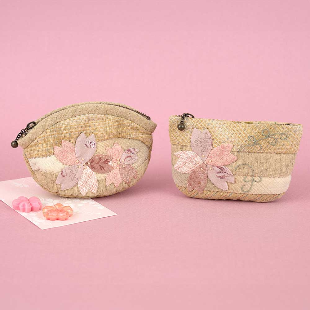 【キット作り方つき】ピースワークのベースに桜をアップリケしたミニポーチ。ころんとした形とマチなしの2個が作れます。どちらも後ろ側はアップリケや刺しゅうなしのデザインです。
