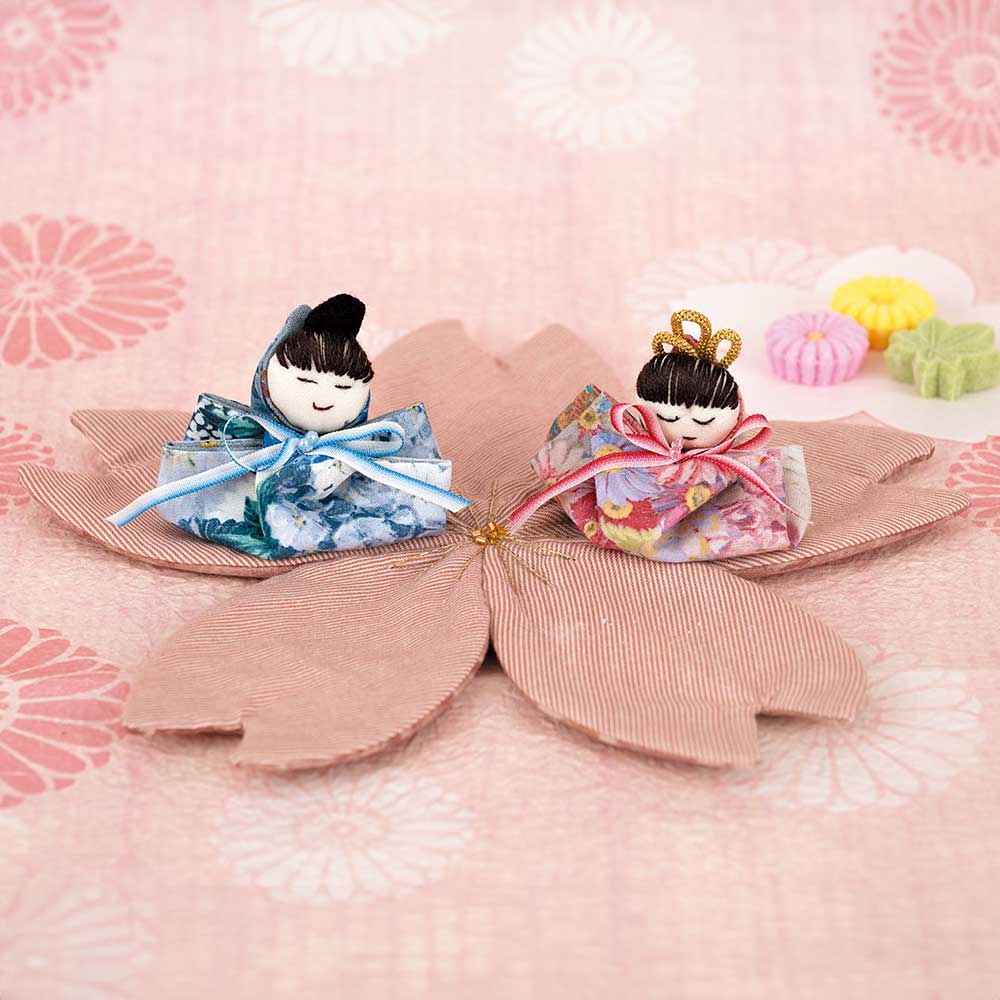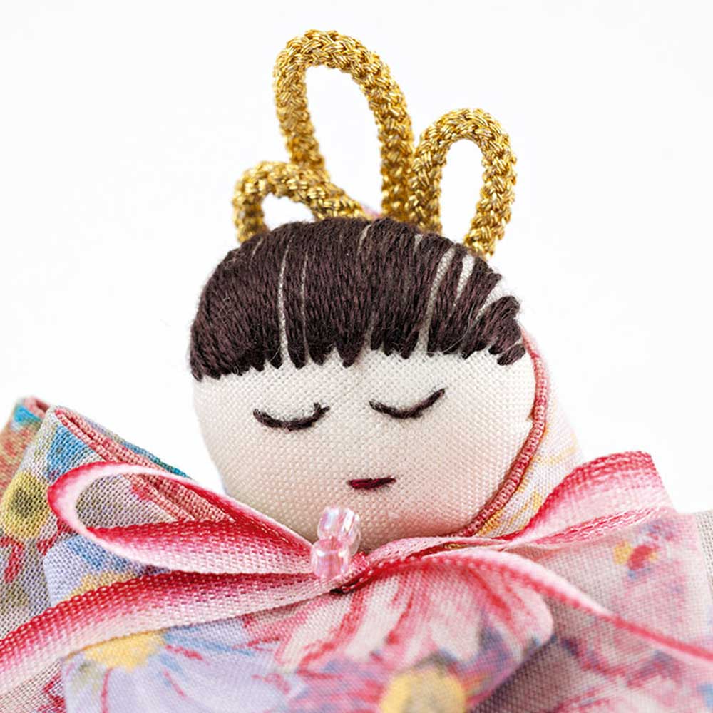 【キット作り方つき】平面のパーツを折り畳んで作るボディーに丸い顔を縫いつける、簡単仕立てのひな飾り です。桜形の敷布がポイント。気軽に作って季節感を楽しめます。髪と顔は刺しゅうで作り、敷布は5弁の花びらを合わせて作ります。