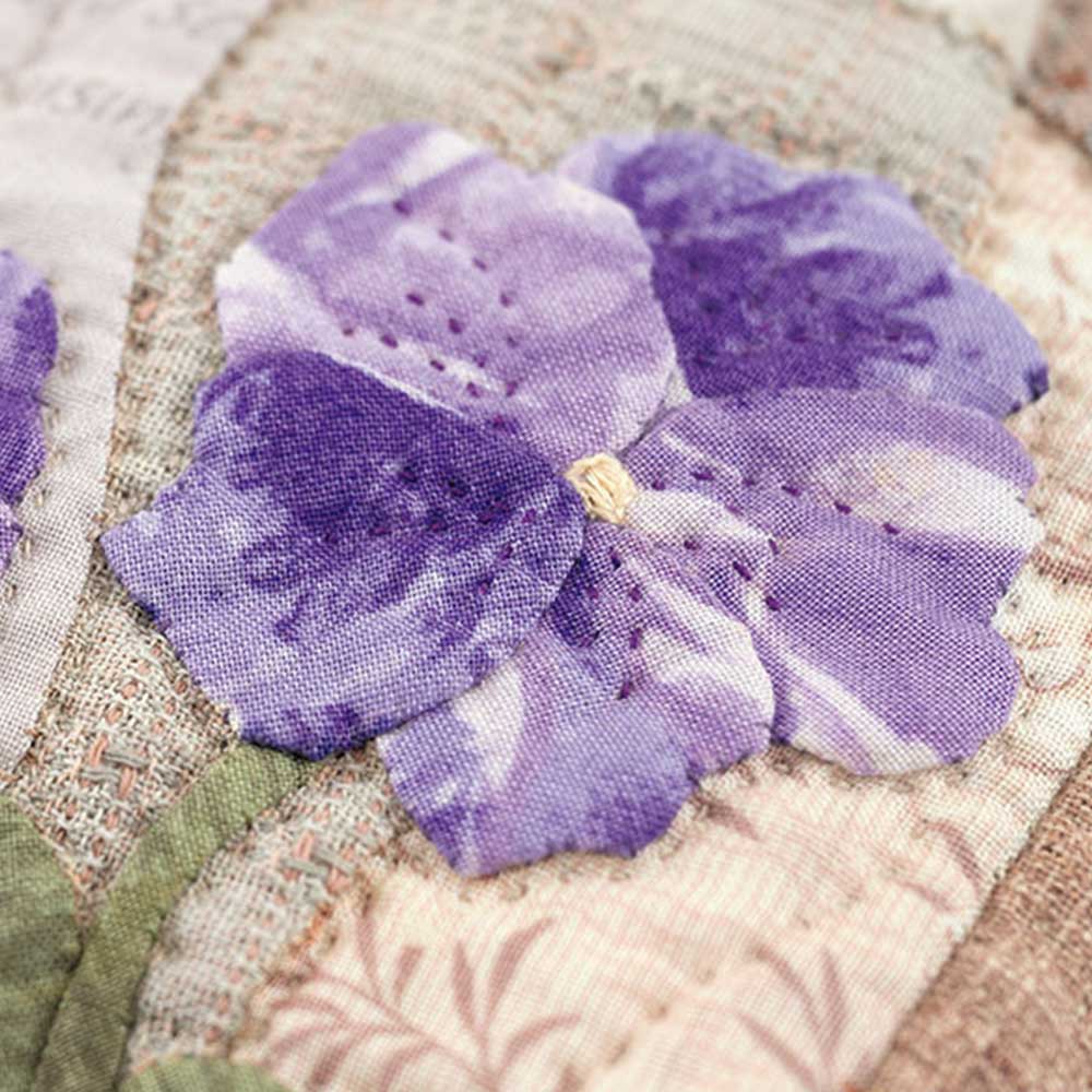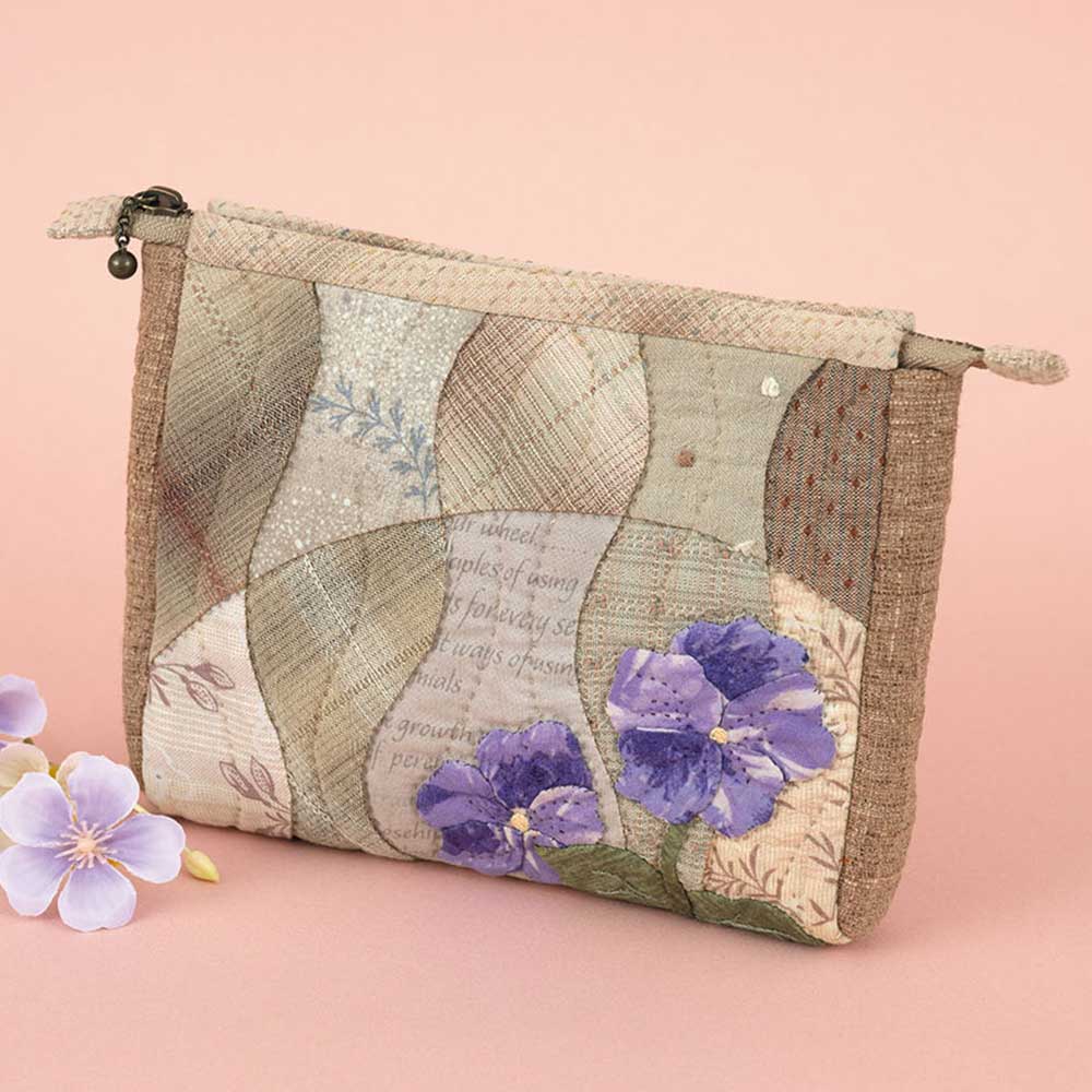 【キット作り方つき】エレガントなビオラの花をアップリケしたポーチです。ピースワークの土台は、赤やピンク系の先染め布にパープル系プリント布など10種の布を合わせます。