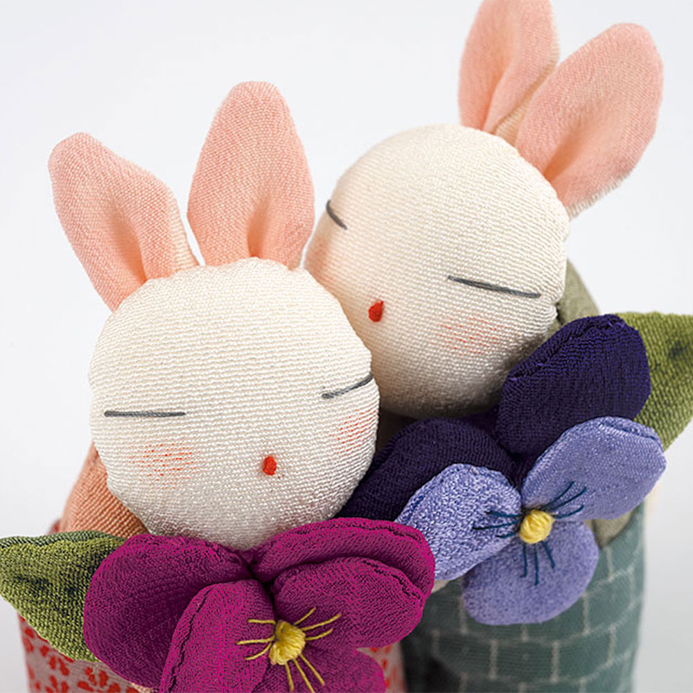 【古裂】【キット作り方つき】ハート形のようにも見える2色のビオラをメインにした、小さなウサギペアの置き飾り。花言葉“誠実”を思わせる様子を、微笑ましく表現しました。
