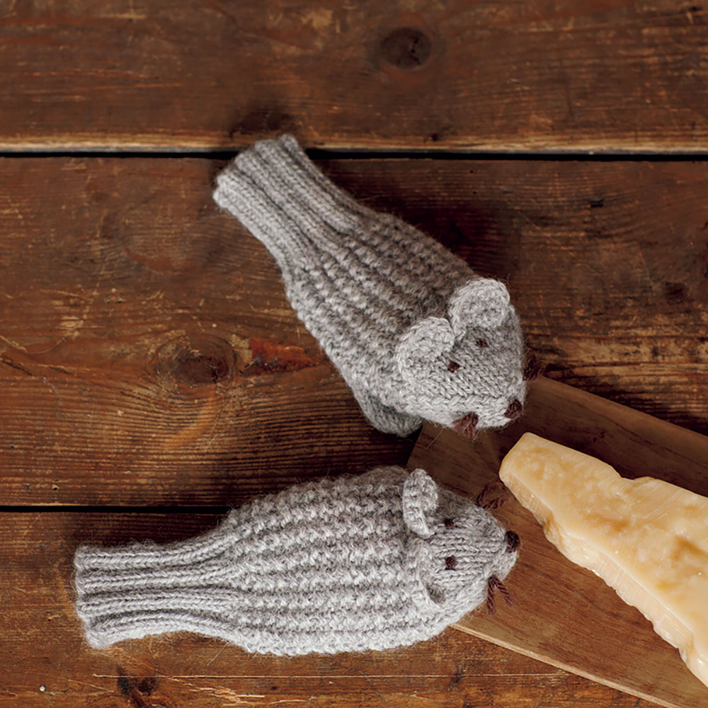 材料:ねずみ…ハマナカ ソノモノアルパカウール《並太》 ライトグレー(64)38gはりねずみ…ハマナカ ソノモノアルパカウール《並太》グレー(65)60g、ファーテープ用の別糸・とじ糸(グレー)少量、厚紙共通…顔の刺しゅう用並太毛糸(こげ茶)少量