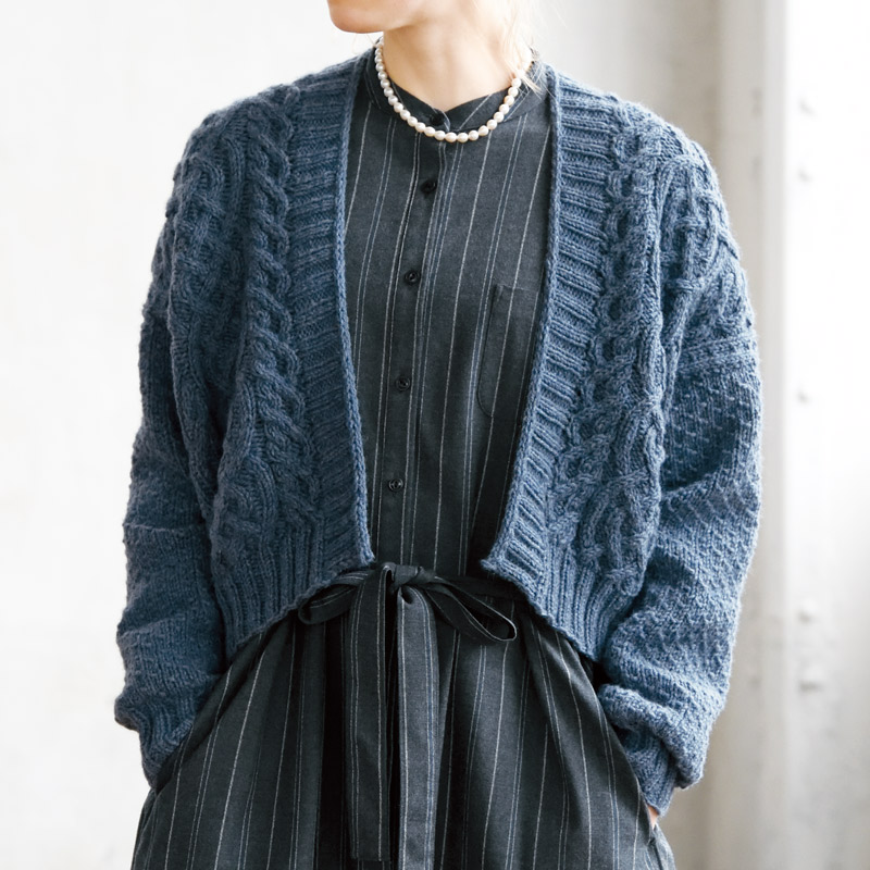 ボリュームのある大きなケーブルが印象的なデザイン。前立ての縁にはアイコードをあしらってしっかりさせます。肩下がりをつけた後ろ身頃と、まっすぐな前身頃の肩線をはぐことで、肩まで模様がきれいに続き、独特なシルエットが生まれます。
