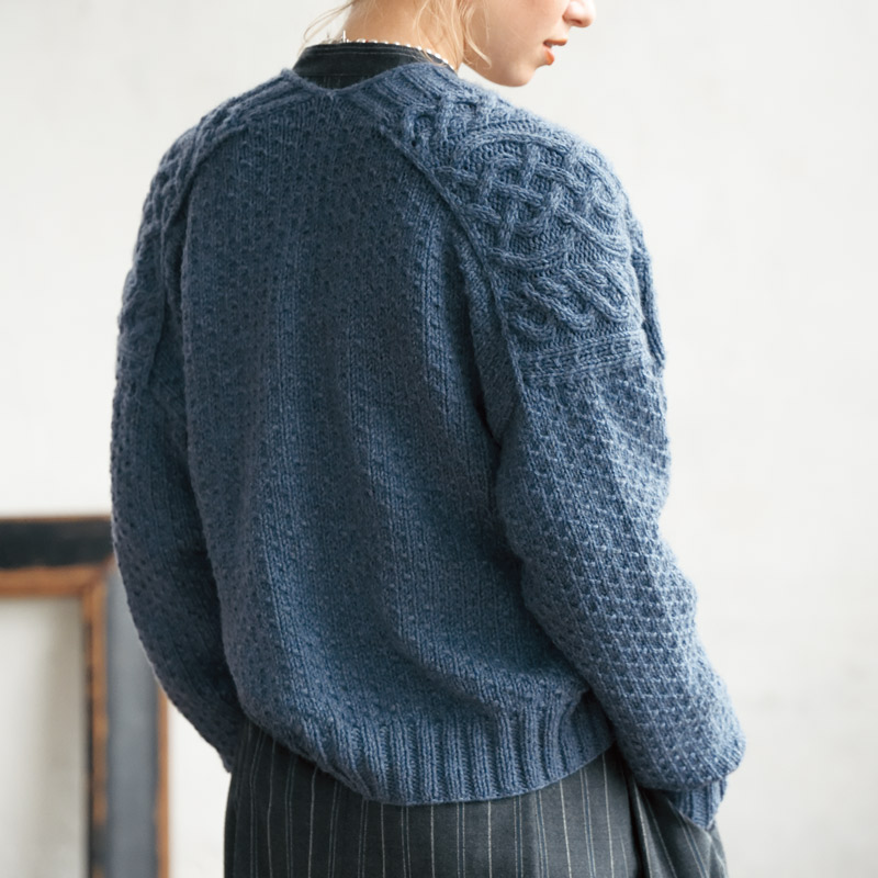 ボリュームのある大きなケーブルが印象的なデザイン。前立ての縁にはアイコードをあしらってしっかりさせます。肩下がりをつけた後ろ身頃と、まっすぐな前身頃の肩線をはぐことで、肩まで模様がきれいに続き、独特なシルエットが生まれます。