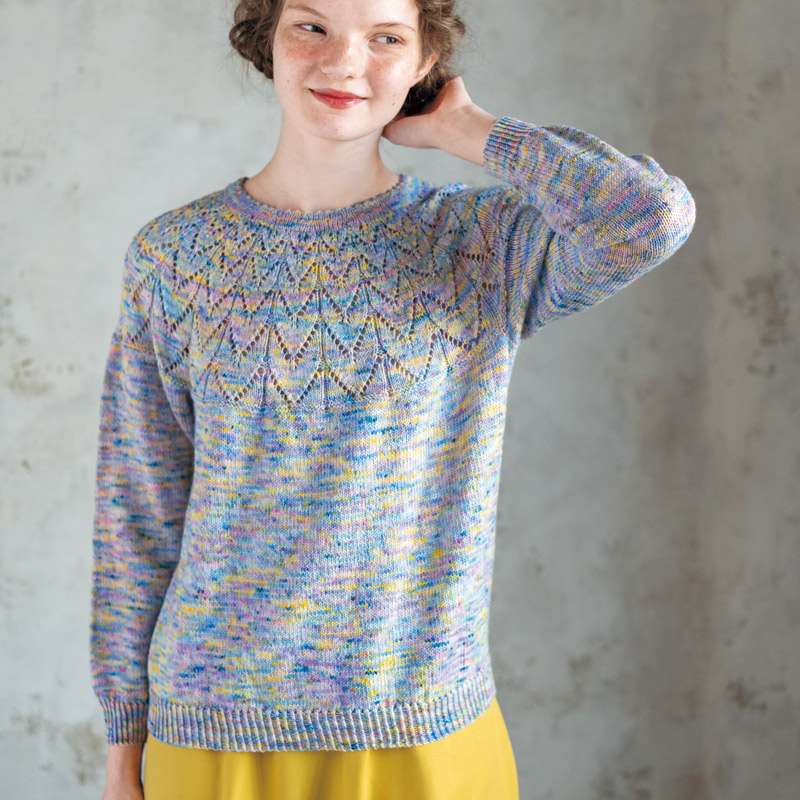 シルエットはオーソドックスに、丸ヨークに透かし模様を並べた使いやすい1着です。メリヤス編みパートも、色の移り変わりが楽しくてどんどん編み進められそう。最後に編む衿ぐりのピコットもかわいいデザインポイント。