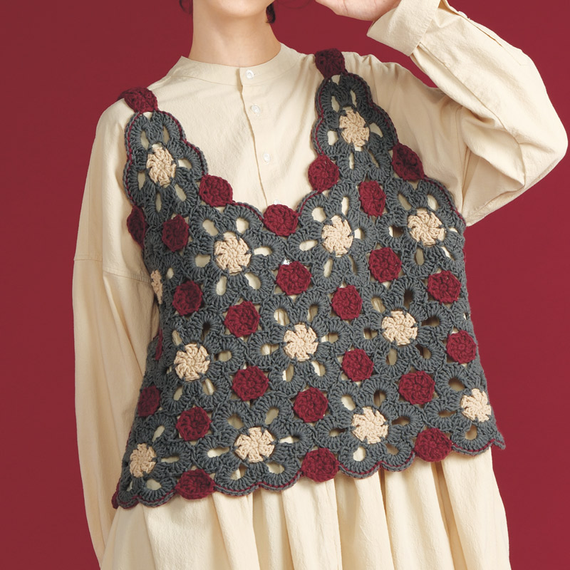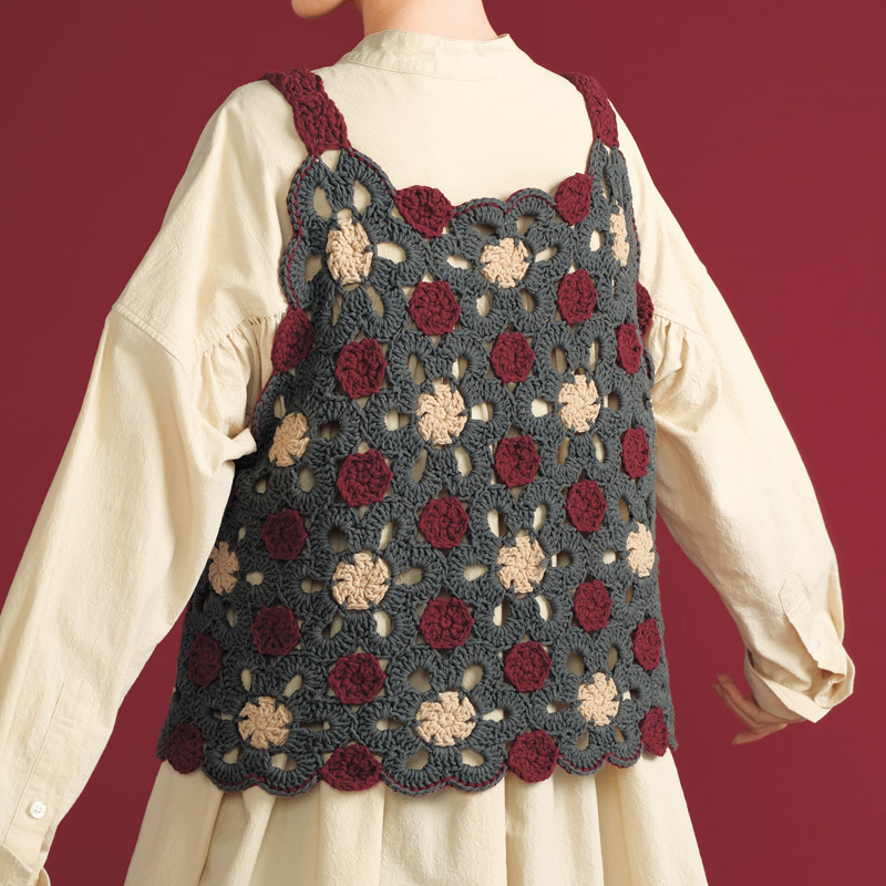 大小2種類のモチーフをつないだキャミソール。シンプル服と合わせてアクセサリーのように楽しむのがおすすめです。モチーフを編みながらつなげていくのは楽しい作業。まず大モチーフを編んでつなげ、小さなモチーフで間を埋めていきます。