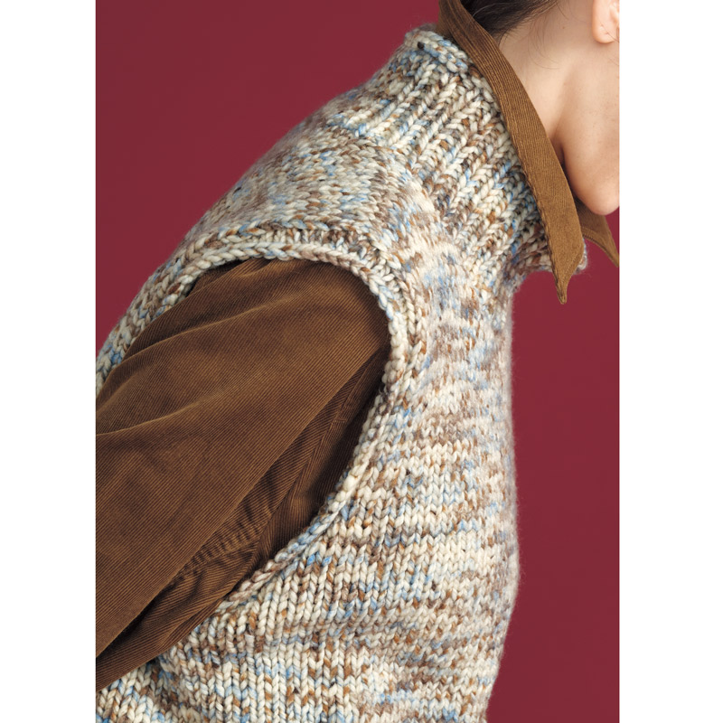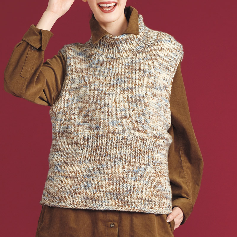 上品な色合いのメランジヤーンのハイネックベストは、ウエスト部分の1目ゴム編みがポイント。目数はそのまま、部分使いにしたことで、無理なく、程よくウエストまわりがシェイプされ、おしゃれなシルエットのできあがり。ひと手間を楽しむ手編みならではのデザインです。