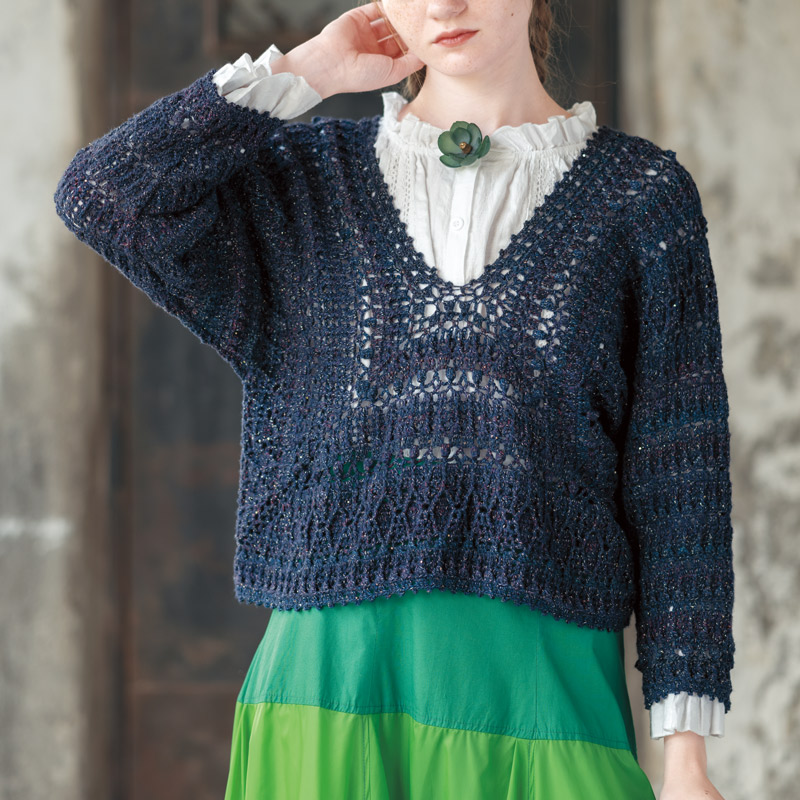 段染めヤーンのプルオーバーは、作り目を輪にし、まん中があいたモチーフを編むように前後身頃を続けてぐるぐると編み進みます。編み甲斐のある模様と極小のスパンコールが輝くグラデーションの相性も抜群!後ろのあきが気になる場合は、縁編みにひもやリボンを通して編み上げにしても。