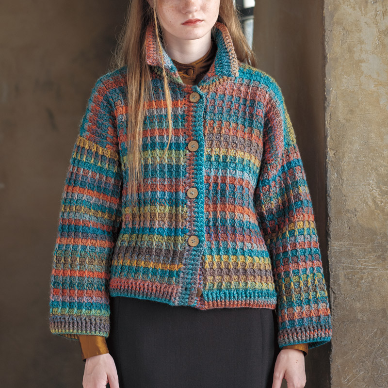 美しいグラデーションに引き上げ編みが入ると、規則性が崩れて予測不能な深みがプラスされます。適度なボリューム感と厚みのある編み地も魅力的。暖冬の昨今、コートより出番が多くなりそうな1着です。