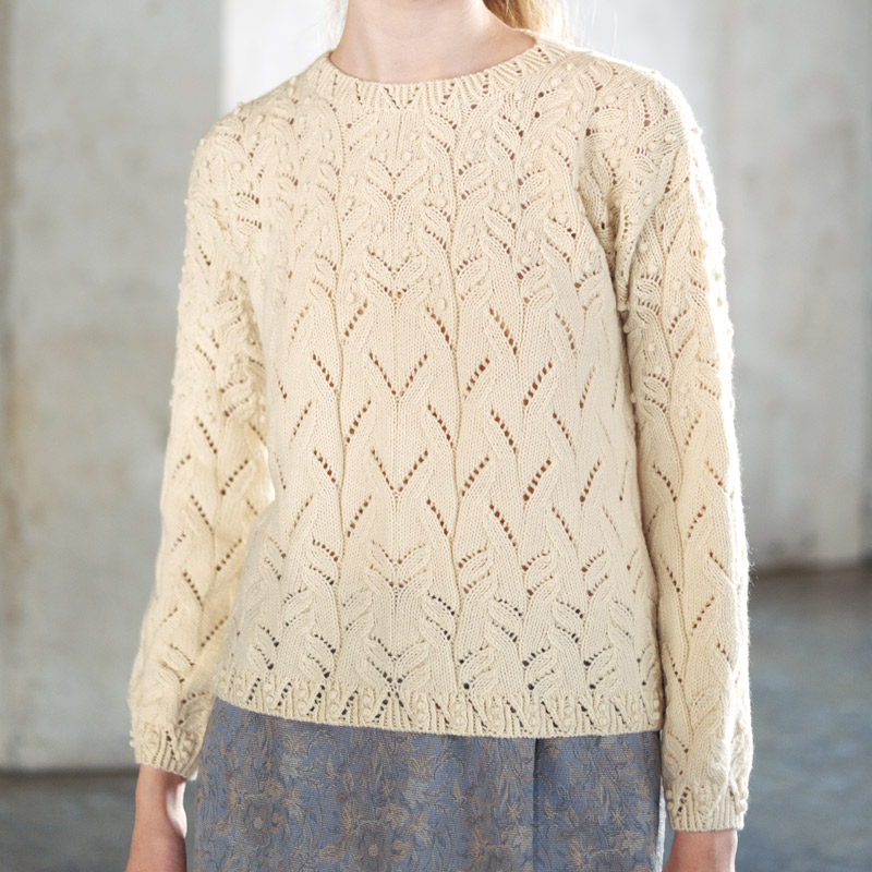 思い出深い初めての作品集「大人のクチュール・ニット」の中から読者の皆さまのアンケートで一位に選ばれた作品のアレンジを試みました。縦の区切りのジグザグレースを取り除き、身頃の中心から対称に模様を配置します。毎段のレース模様は裾と身頃上部のみにして、間は2段のレース模様に変えています。これで随分イメージが変わりましたが、さらにボッブルは小さく編み、数も減らして部分使いにしました。