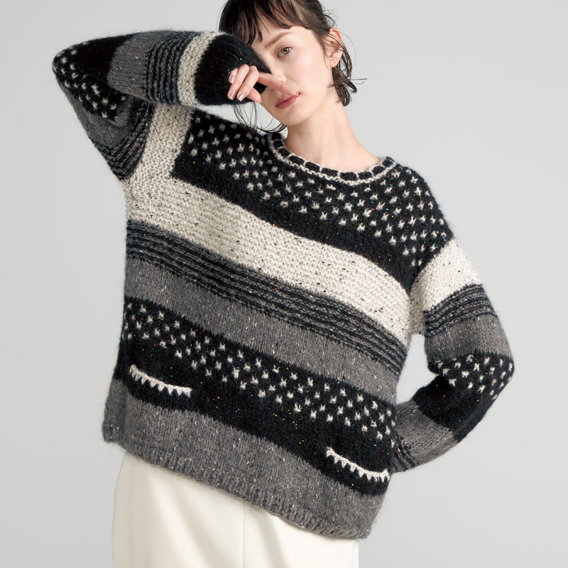 プルオーバーは黒の「アラザン」、グレーと白の「カッサータ」のモノトーンでまとめてみました。水玉のようなすべり目とボーダーでカジュアルな雰囲気に仕上げています。ウエストの下に小さなポケットをつけ、ポケット口は細編みでボタンホールステッチ風に。鎖編みと引き抜き編みで大きな玉編みのようになる編み方で衿ぐりに縁編みをして、簡単ですがインパクトのある面白い編み地になっています。