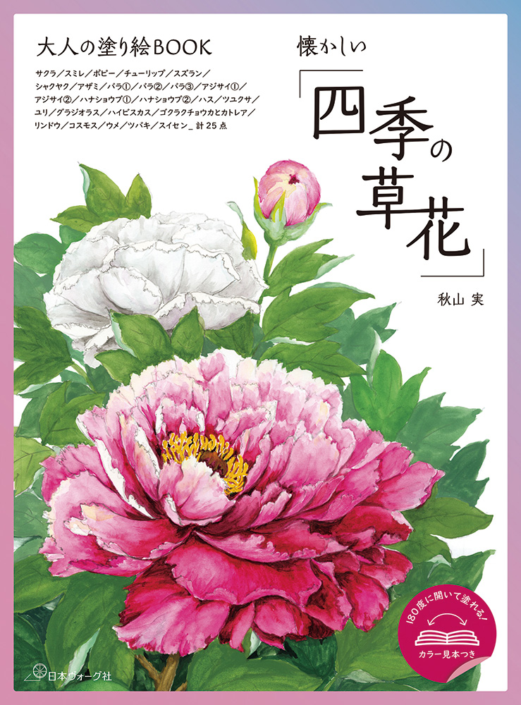 老若男女に馴染みのある四季の草花をカラー見本・塗り絵各25点収録。180度に開いても落丁しないPUR製本で、カラー見本(左頁)と塗り絵(右頁)が見開きとなっているので塗り絵が苦手な方でも楽しく塗ることができる。塗り方のポイント、画材の解説、各作品にワンポイントアドバイスつき。