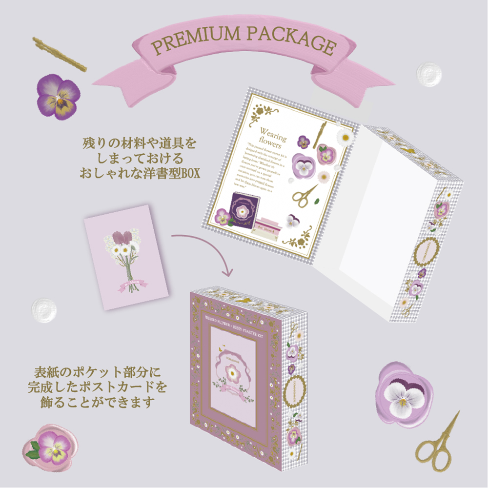 パッケージは洋書型のBOXとなっており、余った材料やレジンの道具を収納できる仕様になっています。また、パッケージ表面のポケットには作った押し花ポストカードを入れてそのまま飾ることができます。