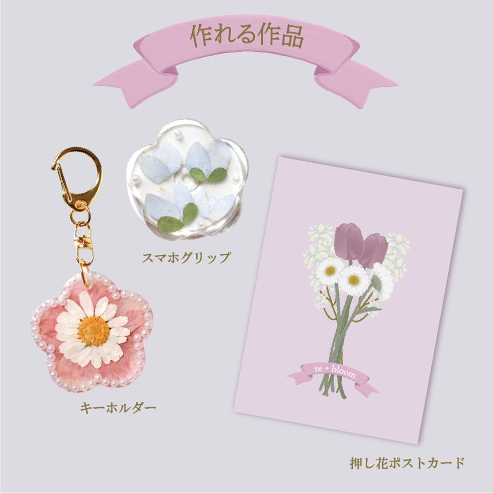 キーホルダー・スマホグリップ・押し花ポストカードの3作品が作れます。