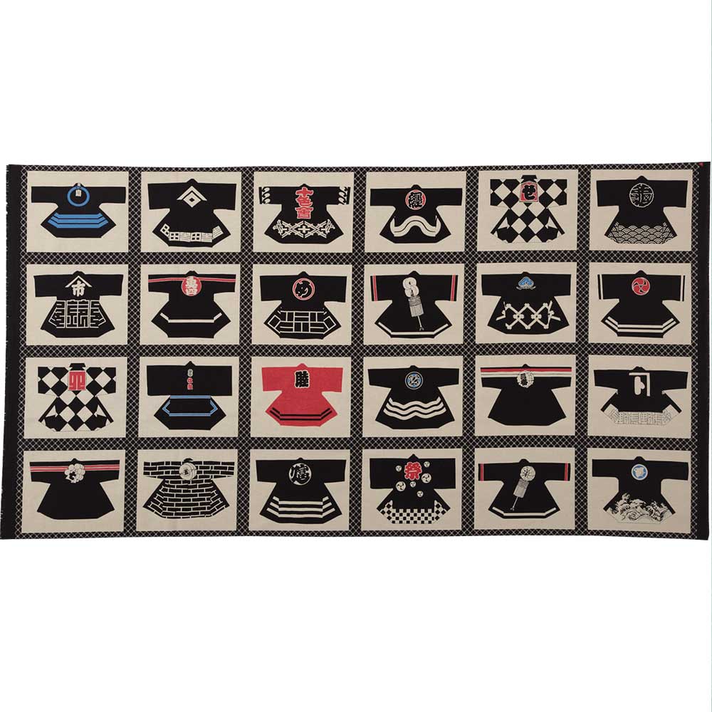 【法被を並べた粋な柄。そのままタペストリーやのれんとして、また小さめの柄サイズを生かして小物にも。法被サイズ約縦10×横14cm。