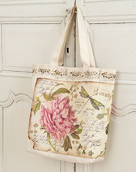 イタリア・スタンぺリア社の和紙のような風合いで破れにくい「ライスペーパー」を使った、ペーパークラフト。 特殊なアイロン接着シートを使ってライスペーパーを貼るトートバッグ。芍薬をモチーフにしたエレガントなデザインです。裏面は無地になりますので、別売りの「ロース柄のライスペーパー[アイロン接着シートつき]」がおすすめです。